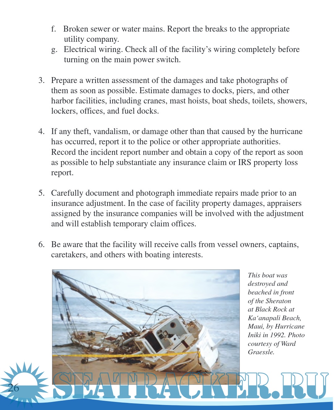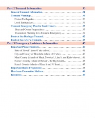 Description: This updated manual provides a summary of the actions boaters and other members of Hawai‘i’s marine community can take before, during, and after a hurricane or tsunami. It is intended to assist in preparing for and mitigating the effects of these hazards. It includes information on these events and their dangers, provides guidelines to develop a personal preparedness plan, and lists emergency assistance information (that is, phone numbers, radio frequencies, and hurricane evacuation shelter locations). The statements and procedures contained in this manual may be modified or supplemented to meet the specific needs of individual boat owners. It is intended that this manual complement state statutes, Hawai‘i administrative rules, county codes and ordinances, whose provisions shall prevail in the event of a conflict.
