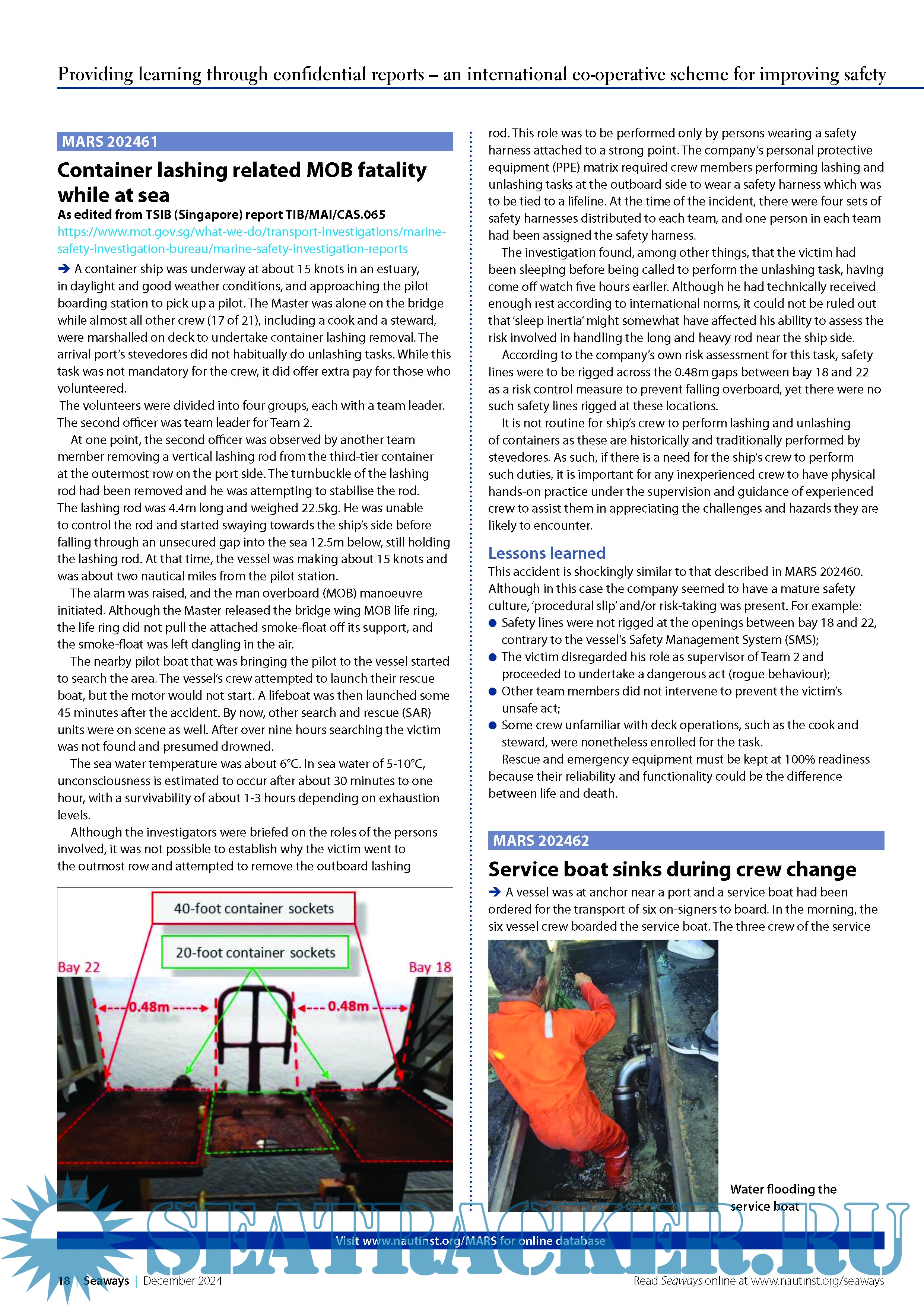 Year: 2024 Language: English Author: The Nautical Institute Genre: Periodical publication Edition: issue No.386 December, 2024 Format: PDF Quality: eBook Pages count: 4 Description: Providing learning through confidential reports an international co-operative scheme for improving safety. MARS is a searchable database containing reports of accidents and near misses stretching back over a quarter of a century. Funded through the generous support of the Institute's Nautical Affiliate partners, it is one of the maritime industry's leading risk reduction initiatives and is helping to make life safer for seafarers everywhere.