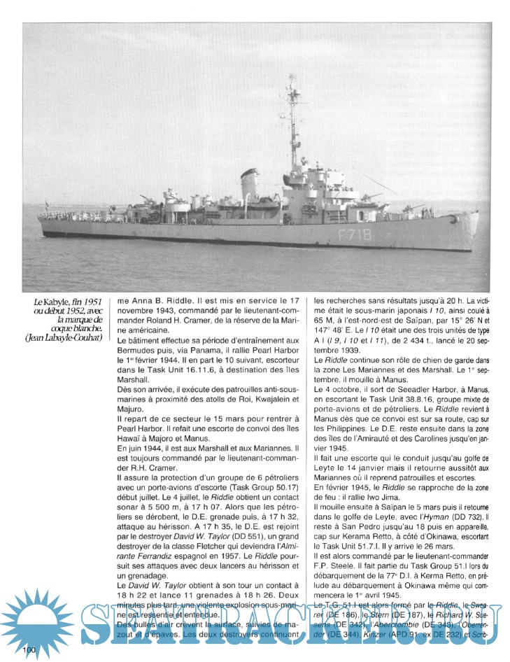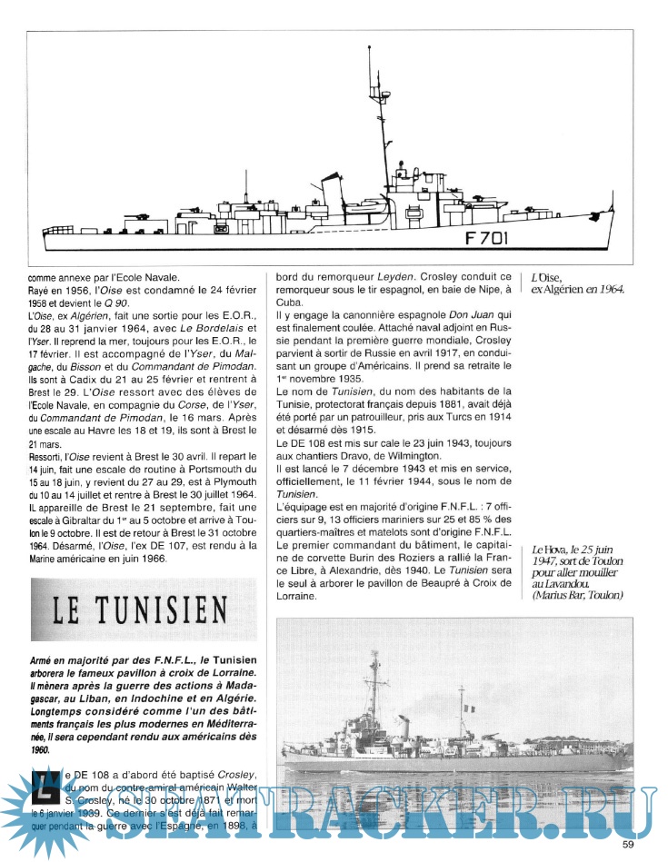 Description: Pour combattre les sous-marins allemands dans la bataille de l'Atlantique, les chantiers américains construisent entre 1942 et 1945 une série de plus de 500 unités appelées destroyers d'escorte (DE). La Marine nationale en arme six début 1944 pour démarrer sa reconstitution après les pertes de 1942, puis huit autres en 1950 et 1952, dans le cadre de l'OTAN, le traité de l'Atlantique Nord. Ces quatorze bâtiments, devenus les escorteurs type Sénégalais, permettent à la Marine d'assurer ses missions jusqu'à la fin des années cinquante, notamment l'entraînement à la lutte anti-sous-marine et la surveillance maritime en Algérie, en attendant la mise en service des escorteurs rapides issus des programmes d'après guerre.