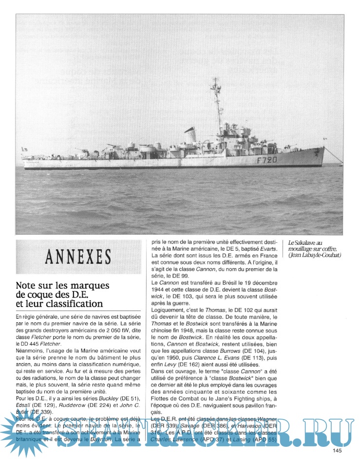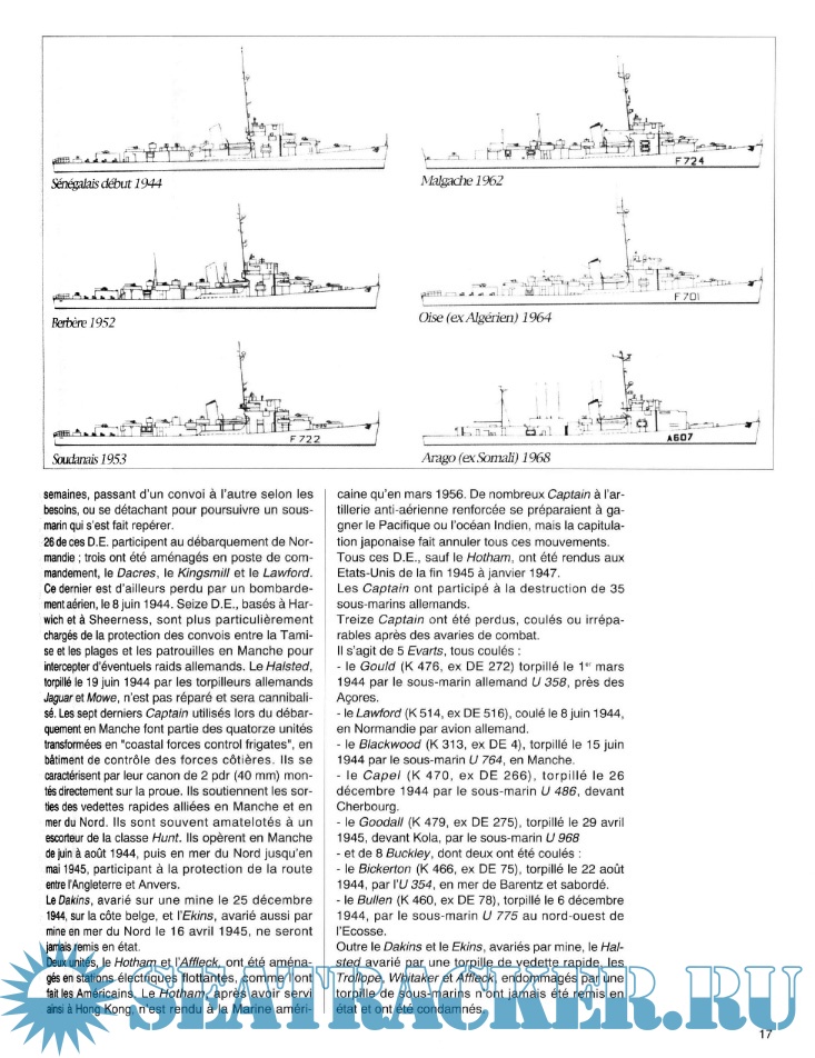 Year: 2004 Language: French Author: Jean Moulin Genre: Historical Format: PDF Quality: Scanned pages Pages count: 153 Description: Pour combattre les sous-marins allemands dans la bataille de l'Atlantique, les chantiers américains construisent entre 1942 et 1945 une série de plus de 500 unités appelées destroyers d'escorte (DE). La Marine nationale en arme six début 1944 pour démarrer sa reconstitution après les pertes de 1942, puis huit autres en 1950 et 1952, dans le cadre de l'OTAN, le traité de l'Atlantique Nord. Ces quatorze bâtiments, devenus les escorteurs type Sénégalais, permettent à la Marine d'assurer ses missions jusqu'à la fin des années cinquante, notamment l'entraînement à la lutte anti-sous-marine et la surveillance maritime en Algérie, en attendant la mise en service des escorteurs rapides issus des programmes d'après guerre.