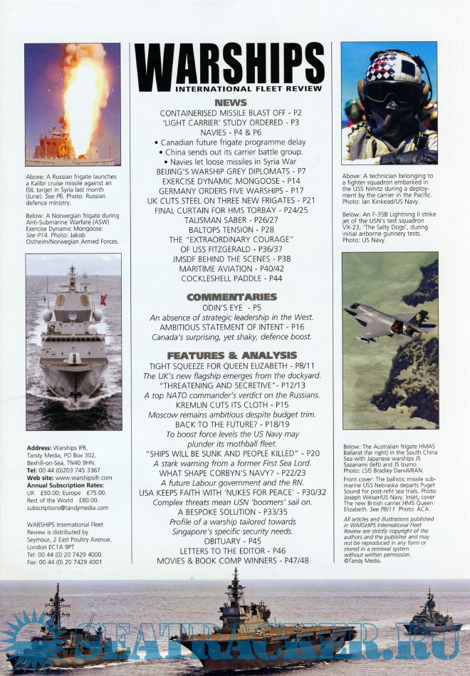 Description: Warships IFR puts the spotlight on the latest developments in the world’s navies. It covers current defence issues and has comments by leading analysts. The magazine regularly includes features on the Royal Navy and the US Navy in addition to incorporating news and features on all other navies across the globe. Warships IFR frequently carries in-depth articles on naval heritage.WARSHIPS International Fleet Review is published 12 times a year by Tandy Media Ltd who also publish Shipping Today & Yesterday (which provides news and features from the world of merchant shipping).