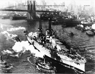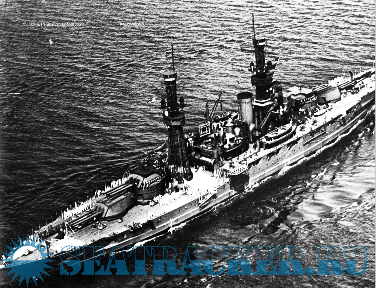 Description: USS Pennsylvania (BB-38) was the lead ship of the Pennsylvania class of super-dreadnought battleships built for the United States Navy in the 1910s. The Pennsylvanias were part of the standard-type battleship series, and marked an incremental improvement over the preceding Nevada class, carrying an extra pair of 14-inch (356 mm) guns for a total of twelve guns. Named for the Commonwealth of Pennsylvania, she was laid down at the Newport News Shipbuilding and Drydock Company in October 1913, was launched in March 1915, and was commissioned in June 1916. Equipped with an oil-burning propulsion system, Pennsylvania was not sent to European waters during World War I, since the necessary fuel oil was not as readily available as coal. Instead, she remained in American waters and took part in training exercises; in 1918, she escorted President Woodrow Wilson to France to take part in peace negotiations.