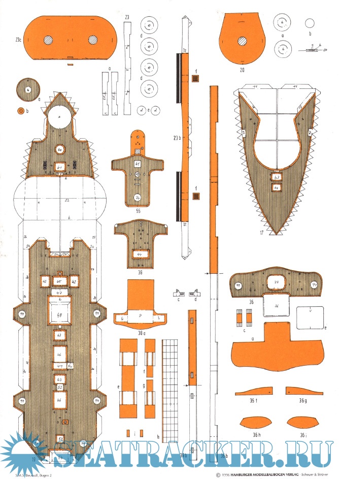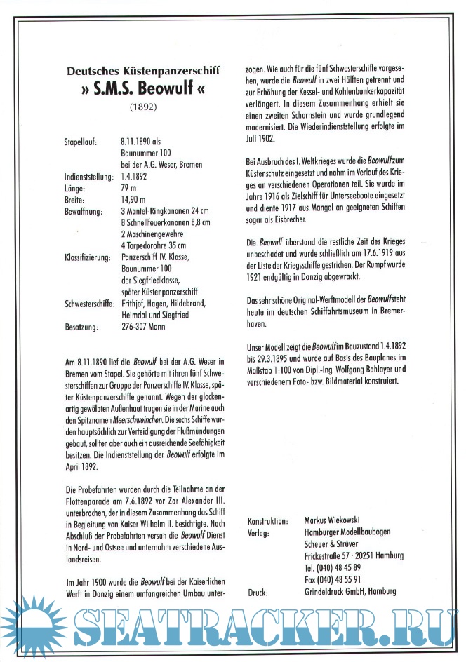 Описание: 16 листов цветных выкроек и инструкций для изготовления бумажной модели германского броненосца SMS Beowulf 1996 год в масштабе 1:250