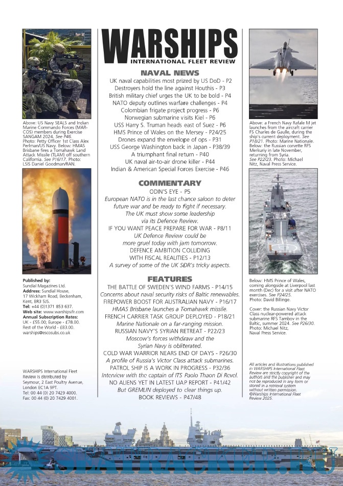 Description: Warships IFR puts the spotlight on the latest developments in the world’s navies. It covers current defence issues and has comments by leading analysts. The magazine regularly includes features on the Royal Navy and the US Navy in addition to incorporating news and features on all other navies across the globe. Warships IFR frequently carries in-depth articles on naval heritage.WARSHIPS International Fleet Review is published 12 times a year by Tandy Media Ltd who also publish Shipping Today & Yesterday (which provides news and features from the world of merchant shipping).