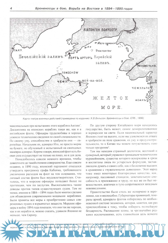 Описание: Предлагаемая вниманию читателя работа является главой классического труда выдающегося английского военно-морского историка Х.В. Вильсона «Броненосцы в бою» ( «Ironclads in action»), изданного в 1896 году в Санкт-Петербурге Военно-морским ученым отделом Главного морского штаба. Книга эта давно стала библиографической редкостью. Между тем, боевые действия на море в период японо-китайской войны, имевшие прямое влияние на развитие кораблестроения и военно-морского искусства накануне трагической для нашего Отечества и флота войны русско-японской, пожалуй, так и не получили с тех пор более подробного и, вместе с тем, столь же красочного и живого описания.