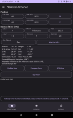Description: Nautical almanac – calculates azimuth, height and other celestial almanac information for Sun and Moon, primary navigation stars and navigation planets: Venus, Mars, Jupiter, Saturn. In addition, for magnetic compass error calculation, finds Variation (Mag. Declination) for given positon. Calculation of variation is based on the latest World Magnetic Model. Gyro and magnetic compass error calculator.