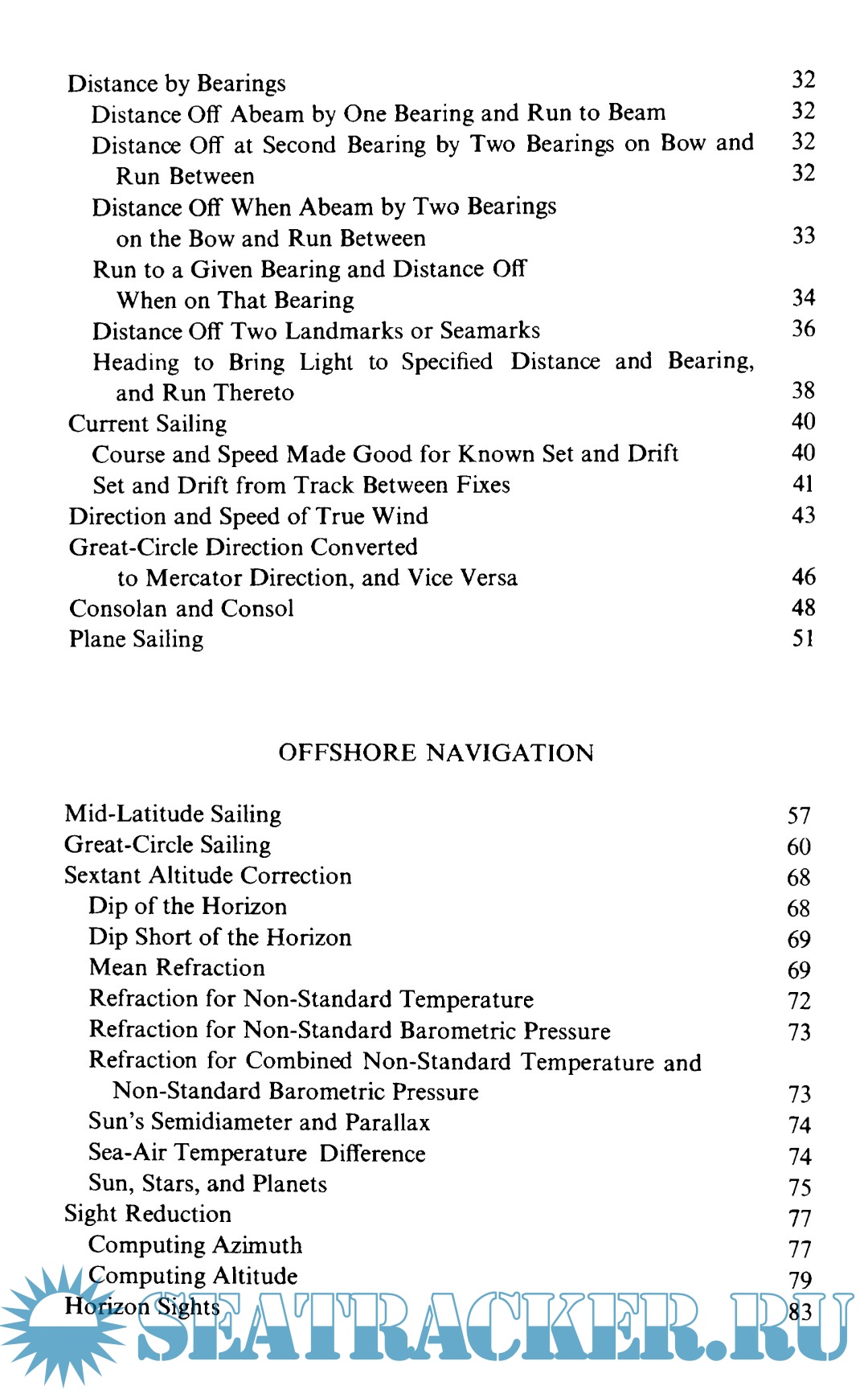 Description: This book contains examples of problems that are most readily solved with the slide rule, and of others that are most readily solved by other means but for which the slide rule can be used when the best means is not available. In addition, it includes two methods of fixing position by observations of a single body. These are given only as a matter of possible interest to the navigator, as instrumentation of sufficient accuracy to permit their successful use afloat is not yet available. The book does not by any means cover all the work that can advantageously be done afloat with the slide rule, and the reader may enjoy discovering a lot more.