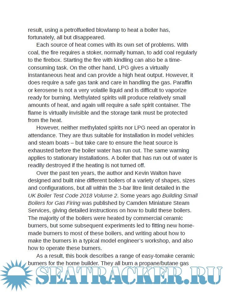 Description: This book covers the materials needed to make ceramic burners and explains how to silver solder them. It discusses LPG and holding tanks, as well as connecting pipework and electronic and mechanical automatic gas-control systems to monitor the boiler pressure. In addition, there is advice on how to set up, install and operate each burner to provide optimum heating to the boiler. A summary of the Boiler Test Code Volume 3 that applies to home-made gas tanks is included, together with a list of useful suppliers with their contact details. This book provides all the information you need to build and operate: three burners, with one variant, for boilers with 42mm, 35mm and 28mm horizontal flues; two round burners for vertical boilers with fire boxes; two different sizes of rectangular burner, with one variant, for use in horizontal water-tube or pot boilers and finally, one small round and one tiny oblong burner for use in Mamod and Wilesco boilers. The burners described are straightforward to make and simple to use to heat the water in boilers that meet the 3 bar litre limit in the UK Boiler Test Code.