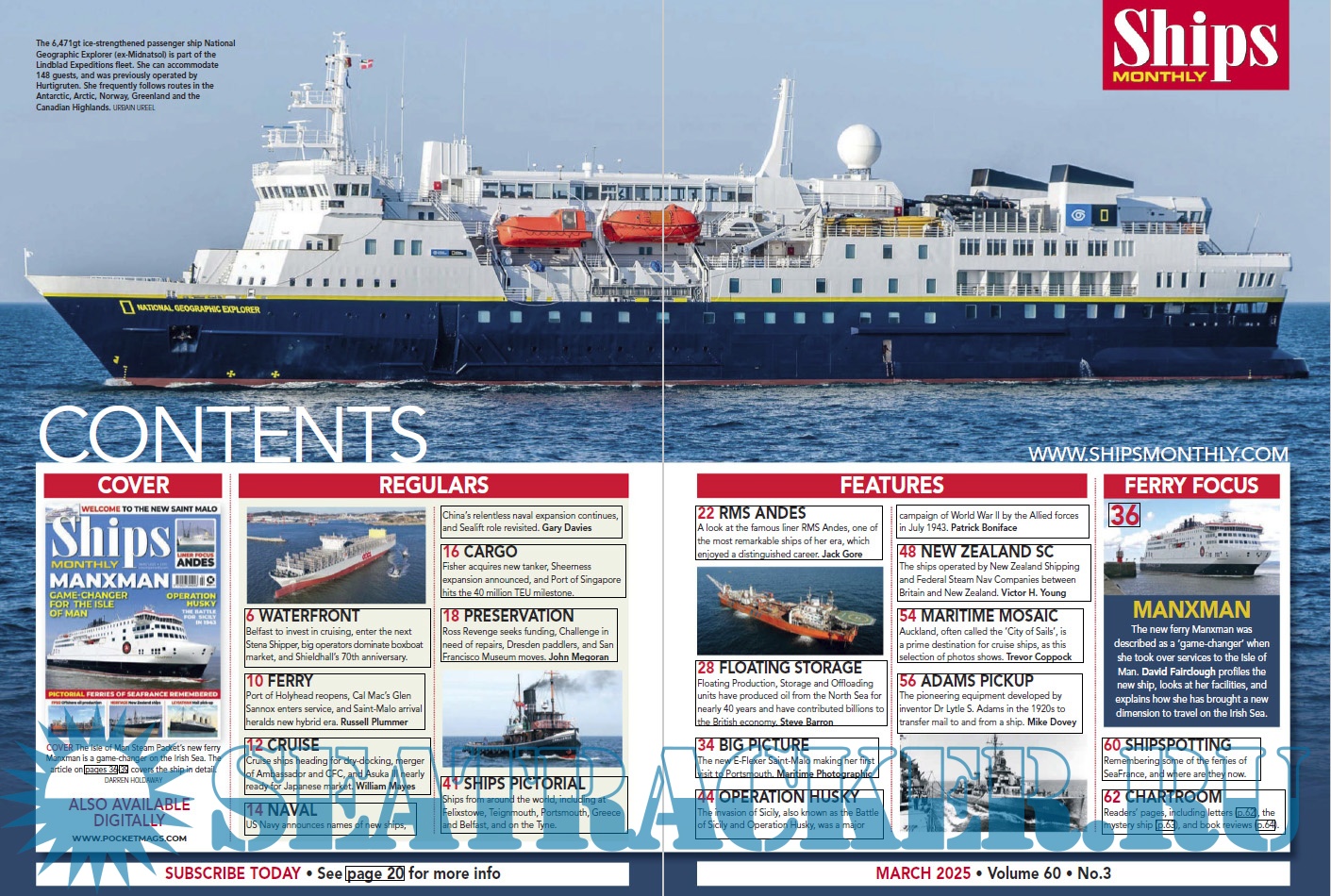 Description: Ships Monthly is the world's leading international shipping magazine. Ships Monthly provides news and features for ship enthusiasts and maritime professionals, including reports on the ferry, cruise, new building and cargo ship scene as well as navies across the world.The latest issue of Ships Monthly is out now, and is packed with all the usual news and features, including outstanding articles and features.