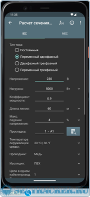 Основные расчеты: Расчет сечения провода, падения напряжения, силы тока, напряжения, активной / полной / реактивной мощности, коэффициента мощности, сопротивления, Максимальная длина провода, Токовая пропускная способность изолированных проводников / неизолированных проводников, Пропускная способность шины, Заполнение кабельных каналов, Подбор автоматического выключателя, Допустимая пропускаемая энергия кабеля (K²S²), Рабочий ток, Реактивное сопротивление, Импеданс, Компенсация реактивной мощности, Реактивная мощность конденсаторов при различных напряжениях, Система заземления, Ток короткого замыкания, Сопротивление проводника, Расчет температуры кабеля, Потери мощности в кабелях, Температурные сенсоры (PT/NI/CU, NTC, термопары…), Значения аналогового сигнала, Эффект Джоуля, Ток повреждения цепей, Оценка риска перенапряжений атмосферного происхождения. Электронные расчеты: Цветовой код резистора / индуктивности, Цветовое значение резисторов, Коды SMD резисторов, Кодировка конденсаторов, Коды индуктивности, Предохранители, Соединение резисторов, Соединение конденсаторов, Резонансная частота, Делитель напряжения, Разветвление тока, Стабилитрон (диод Зенера) как стабилизатор напряжения, Гасящий резистор, Резистор для светодиода, Время работы аккумулятора, Первичная/Вторичная обмотка трансформатора, Длина антенны, Калькулятор дискового пространства и полосы пропускания для систем CCTV. Расчеты двигателя: КПД, Двигатель из трехфазного в однофазный, Конденсаторный запуск однофазного двигателя, Частота вращения электродвигателя, Скольжение электродвигателя, Максимальный крутящий момент, Ток полной нагрузки электродвигателя, Схема трехфазного электродвигателя (6/9/12 отведений от обмотки), Класс изоляции двигателя, Подключение двигателя, Маркировка клемм двигателя. Преобразователи: Преобразование Δ-Y, мощности, Таблица преобразования AWG/мм²/SWG, Сравнение сечений британских и метрических проводов, сечения, длины, напряжения (Амплитуда), sin/cos/tan/φ, энергии, температуры, давления, А•ч/кВт•ч, вар/мкФ, Гаусс/Тесла, RPM (об/мин) - рад/с - м/с, частоты / угловой скорости, крутящего момента, битов и байтов, угловых мер. Ресурсы: Категории применения предохранителей, UL/CSA класс предохранителей, Стандартные значения резисторов, Токо-временные характеристики, Таблица реактивного сопротивления кабелей, Таблица удельного сопротивления и проводимости, Таблица стандартных падений напряжения, Размеры и вес кабелей, Классы защиты IP, Маркировка Atex, Классы приборов, Разрешение систем видеонаблюдения (CCTV), Цветовые коды и данные термопар, Коды стандарта ANSI, Электрические символы, Электричество во всем мире, Типы вилок и розеток, IEC 60320 разъемы, Гнезда C-формы (IEC 60309), Разъемы Nema, Разъемы EV для зарядки электромобилей, Цветовая кодировка проводов, Приставки СИ, Единицы измерения, Размеры трубы. Распиновка: Кабели Ethernet (RJ-45), Ethernet с поддержкой PoE, RJ-9,11,14,25,48, Распиновка, Цветовая кодировка волоконно-оптического кабеля, Scart, USB, HDMI, VGA, DVI, RS-232, FireWire (IEEE1394), Molex, Sata, Apple Lightning, Apple Dock, DisplayPort, PS/2, Raspberry PI, ISO 10487 (Som auto), OBD II, XLR (Audio/DMX), MIDI, Jack, Цветовая маркировка разъемов RCA, Thunderbolt, SD карты, СИМ карты, дисплея LCD 16x2, IO-Link. Приложение также содержит очень полезную форму.