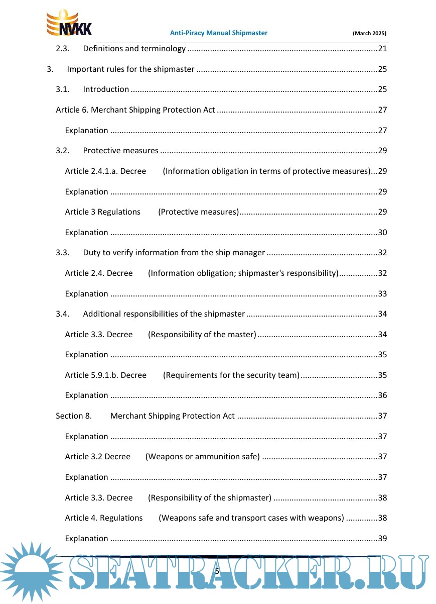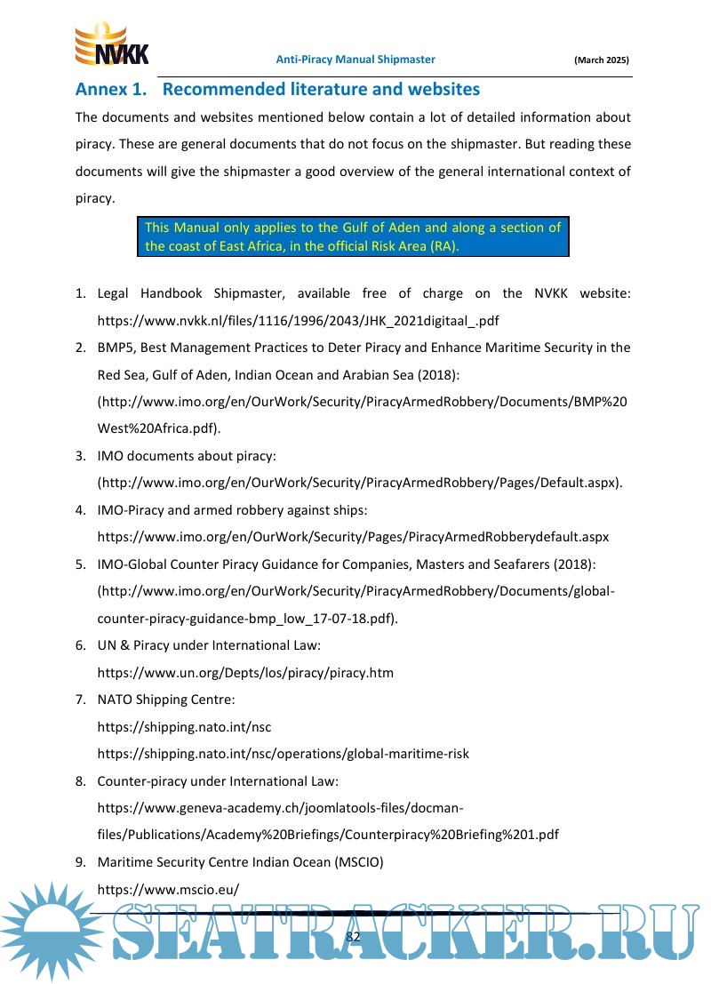 Year: 2025 Language: English Author: Dr. Peter van der Kruit Format: PDF Quality: eBook Pages count: 85 Description: Anti-Piracy Manual for the Shipmaster of a ship flying the flag of the Netherlands. A practical, legal reference work for the Shipmaster to help protect his ship and those on board against pirates in the Gulf of Aden and along a section of the coast of East Africa, in the official Risk Area. This practical Manual, with a large number of uniquely numbered checklists, is intended for masters of ships sailing under the Dutch flag, who may encounter piracy during their voyage. From the preparation of the voyage to the final mandatory travel reports, the shipmaster are guided in their task. The core of this Manual is formed by a number of uniquely numbered checklists to make sure the shipmaster does not forget anything. Furthermore, a number of important subjects are discussed, such as the use of force, notifications and reports, fines, etc. This manual is primarily for the shipmaster, but it is also recommended to all other seafarers and interested parties, such as ship managers, trade unions, educational institutions and the government.