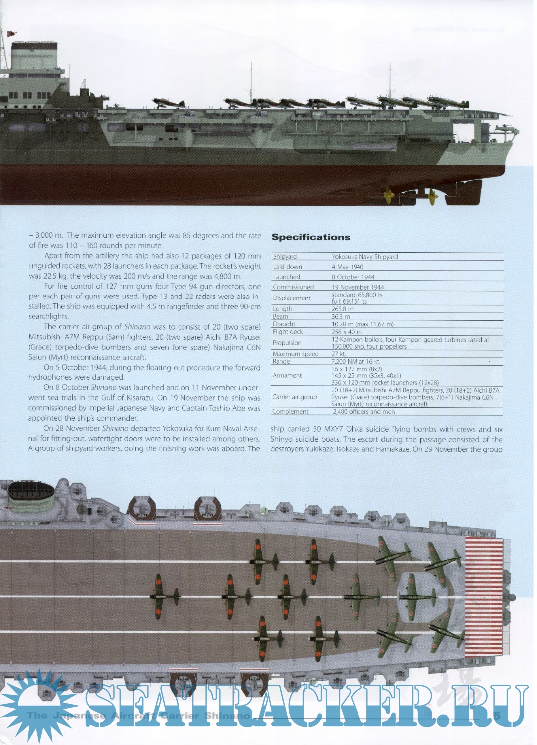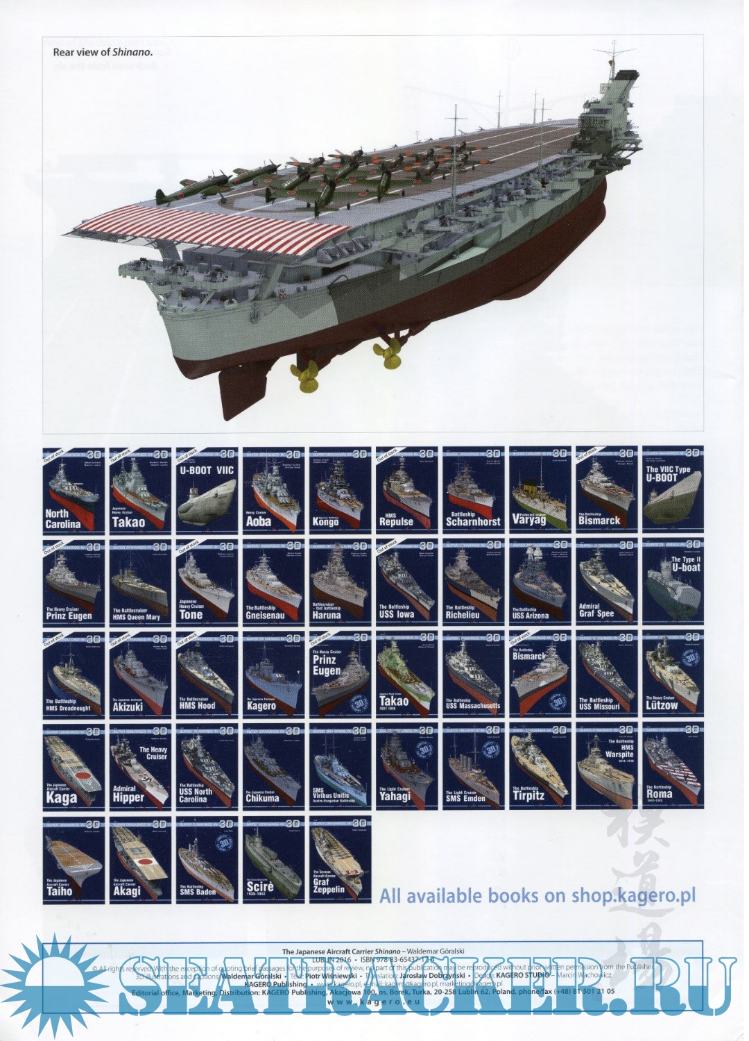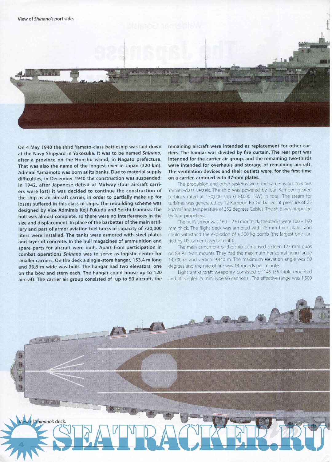 Year: 2017 Language: English Author: Góralski W. Genre: Historical Publisher: Kagero Format: PDF Quality: eBook Pages count: 83 Description: On 4 May 1940 the third Yamato-class battleship was laid down at the Navy Shipyard in Yokosuka. It was to be named Shinano, after a province on the Honshu island, in Nagato prefecture. That was also the name of the longest river in Japan (320 km). Admiral Yamamoto was born at its banks. Due to material supply difficulties, in December 1940 the construction was suspended. In 1942, after Japanese defeat at Midway (four aircraft carriers were lost) it was decided to continue the construction of the ship as an aircraft carrier, in order to partially make up for losses suffered in this class of ships. The rebuilding scheme was designed by Vice Admirals Keji Fukuda and Seichi Izamura.