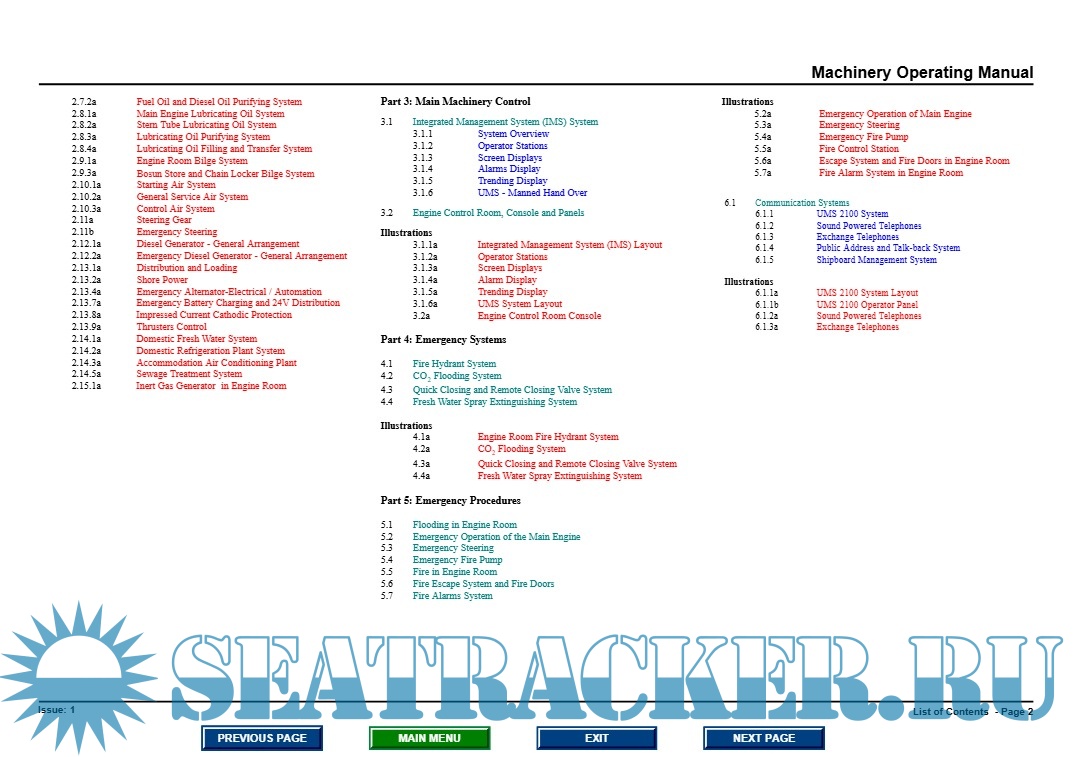 Description: The "Machinery Operating Manual" provides comprehensive guidance for technically proficient ship officers unfamiliar with the vessel, ensuring a clear understanding of its systems and equipment. This manual is intended to supplement existing shipbuilder plans and instruction books without replacing them. It is structured into multiple sections, covering machinery commissioning procedures, operational systems, control systems, emergency firefighting, and internal communication systems. Emphasis is placed on safety protocols, emergency procedures, and compliance with MARPOL 73/78 regulations. Detailed illustrations, system schematics, and standardized symbols are included to enhance comprehension and operational
