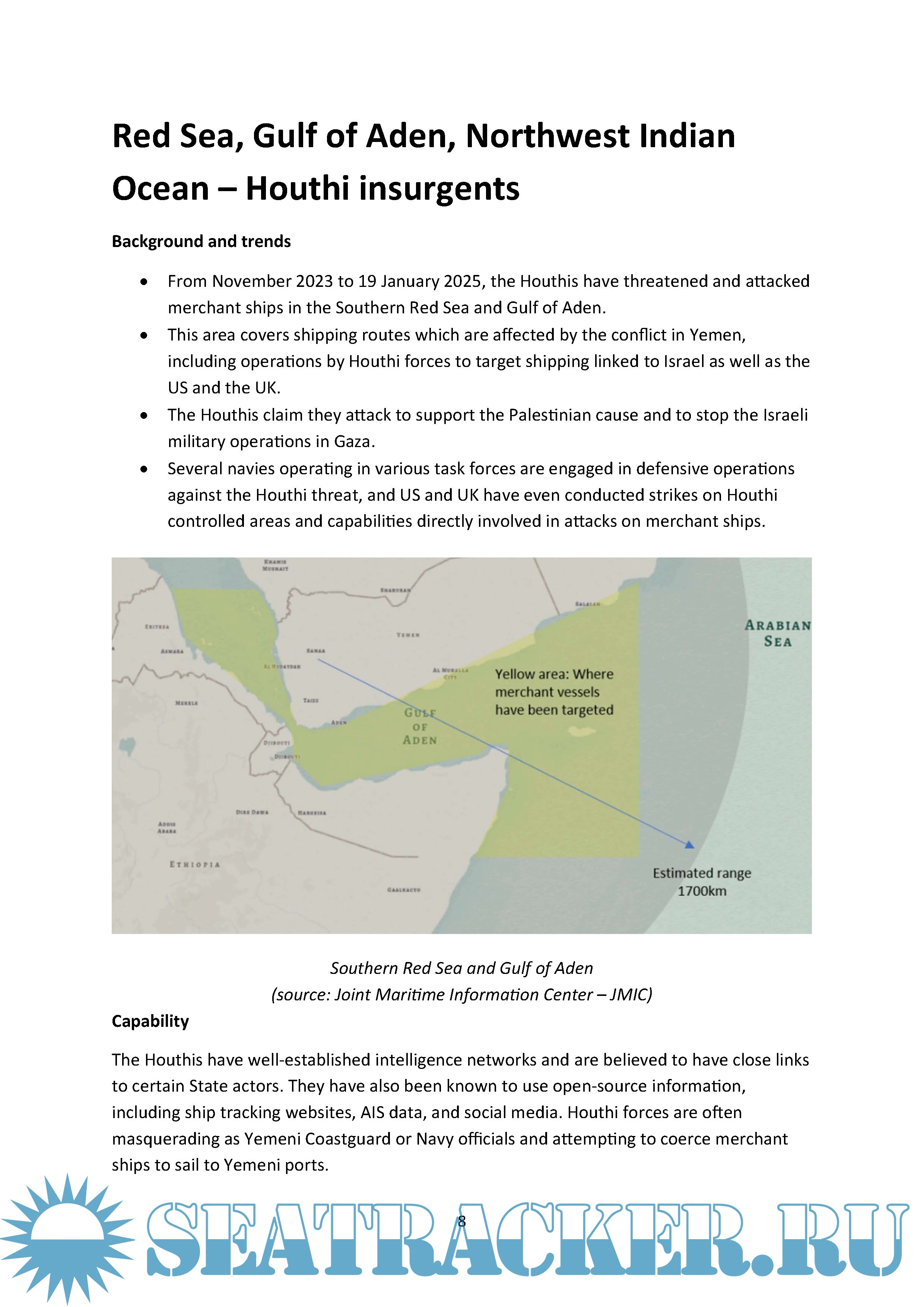 Year: 2025 Language: English Author: ICS and Others Genre: Practical guide Edition: March 2025 Format: PDF Quality: eBook Pages count: 18 Description: The purpose of the MISTO is to provide an overall understanding of prevailing security threats. The MISTO has been compiled to provide general and situational information regarding the maritime domain. MISTOs are based on an amalgamation of publicly available information and information obtained by the authors through their networks of stakeholders in shipping, governments, and academia. The information contained herein is based on data available as of the date of this assessment and is subject to change without notice. The MISTO does not constitute a guarantee of the accuracy, completeness, or timeliness of the information provided. MISTOs focus on the physical threats to maritime that have with potential to cause serious harm to people, environment, ship, and/or cargo. This includes acts of piracy, armed robbery, terrorism, and war/armed conflict. In cases where physical security threat actors also pose cyber security threats, these are included in the threat description. Threats such as unwarranted detentions, smuggling, stowaways, blackmail, fraud, corruption, etc. are not covered by the MISTOs.