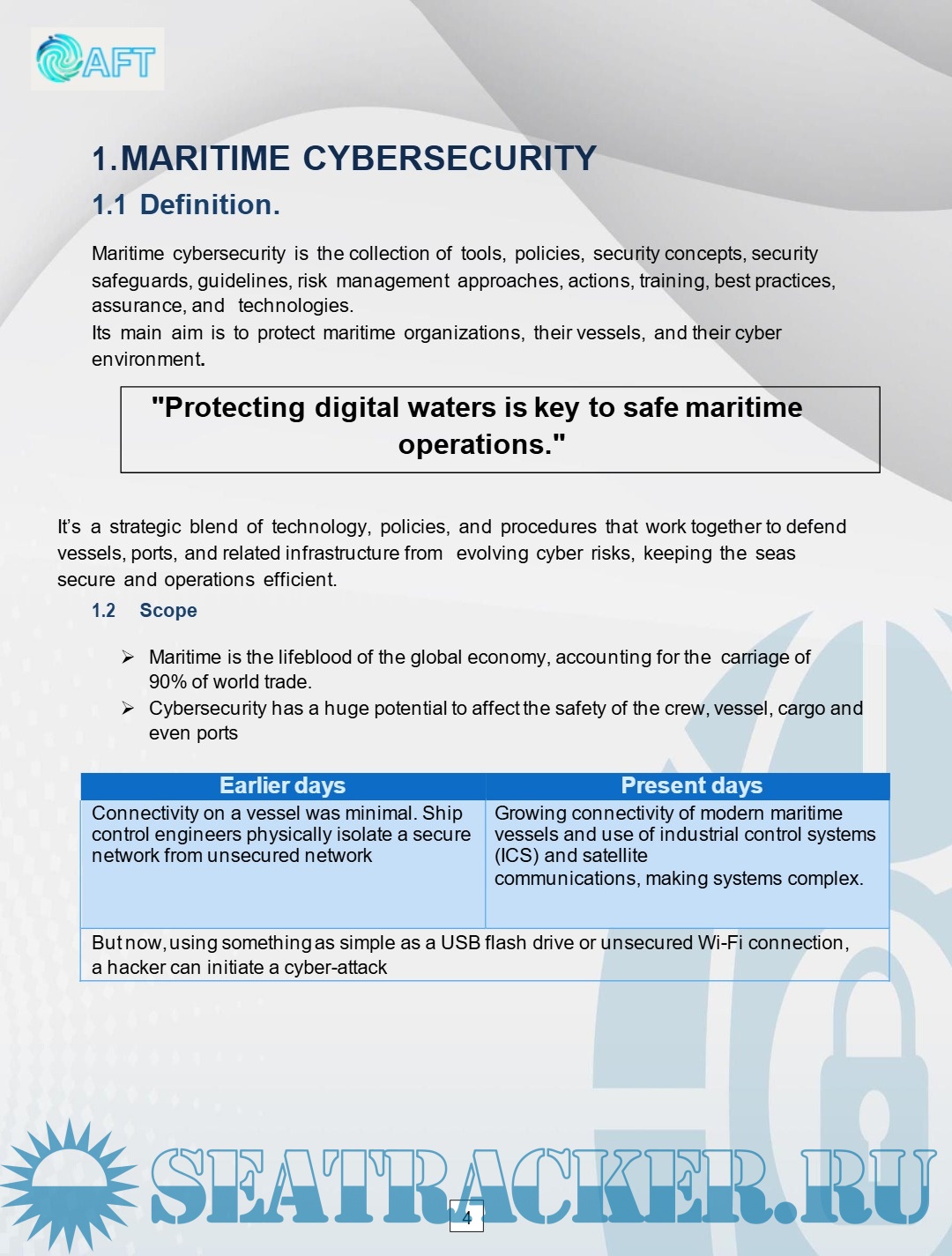 Description: Maritime cybersecurity is the collection of tools, policies, security concepts, security safeguards, guidelines, risk management approaches, actions, training, best practices, assurance, and technologies. Its main aim is to protect maritime organizations, their vessels, and their cyber environment.