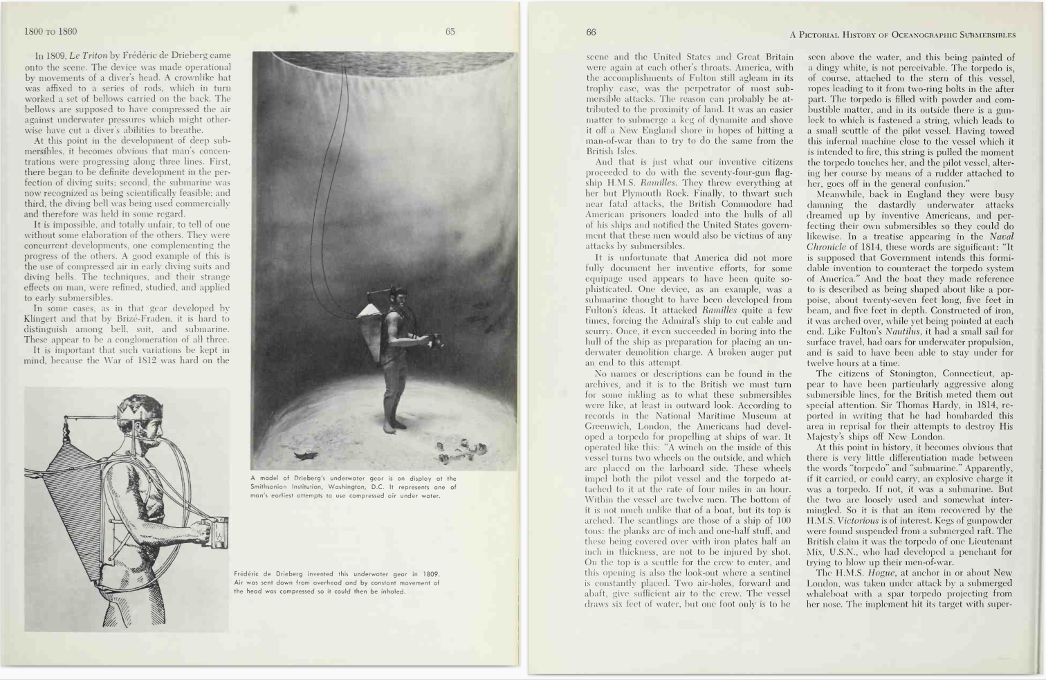 Now follows a parade of submarine innovators and their inventions, including Robert Fulton's Nautilus; Hunley's David, which during the Civil War sank the Union ship Housatonic; John Holland's many models of his Holland class; American, English, German, Russian, and Japanese submarines of World Wars I and II ending with the American atomic classes of submarines from the first one, the U.S.S. Nautilus, to the polaris-missile-equipped U.S.S. George Washington.