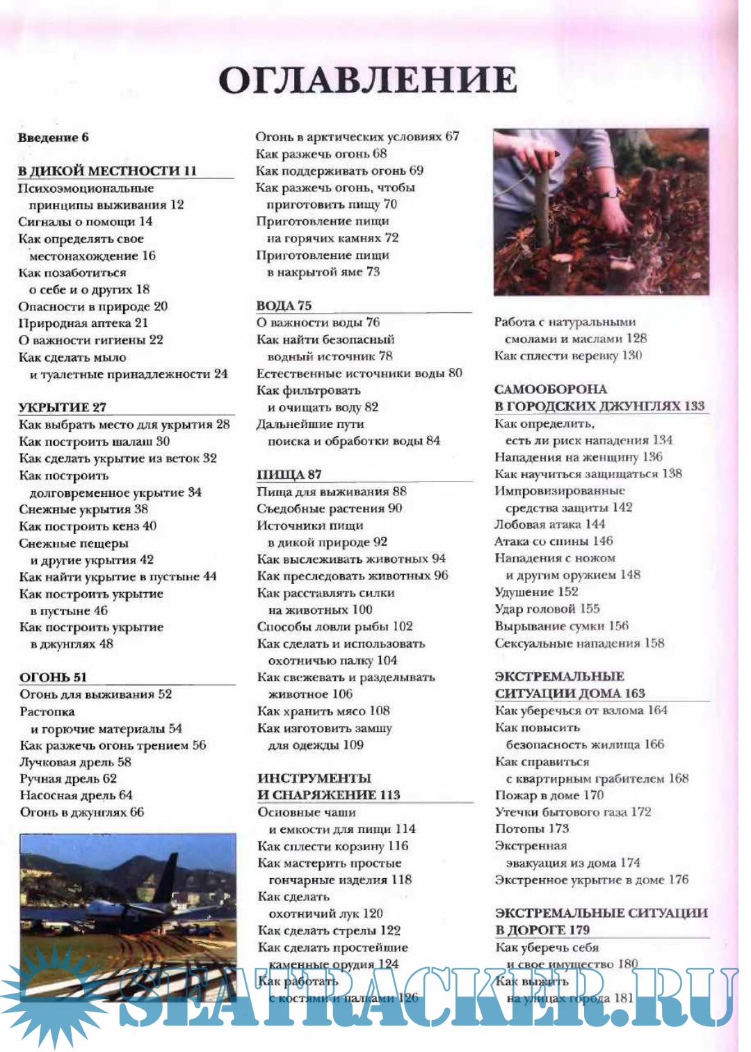 *Как выжить в различных климатических условиях и в дикой местности: как построить укрытие и найти воду, как развести огонь и добыть пищу, как защититься от неблагоприятных погодных условий и нападения диких животных, как изготовить необходимые орудия и снаряжение, как приготовить лечебные средства и оказать неотложную медицинскую помощь