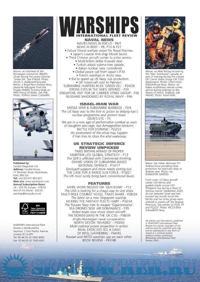 Description: Warships IFR puts the spotlight on the latest developments in the world’s navies. It covers current defence issues and has comments by leading analysts. The magazine regularly includes features on the Royal Navy and the US Navy in addition to incorporating news and features on all other navies across the globe. Warships IFR frequently carries in-depth articles on naval heritage.WARSHIPS International Fleet Review is published 12 times a year by Tandy Media Ltd who also publish Shipping Today & Yesterday (which provides news and features from the world of merchant shipping).