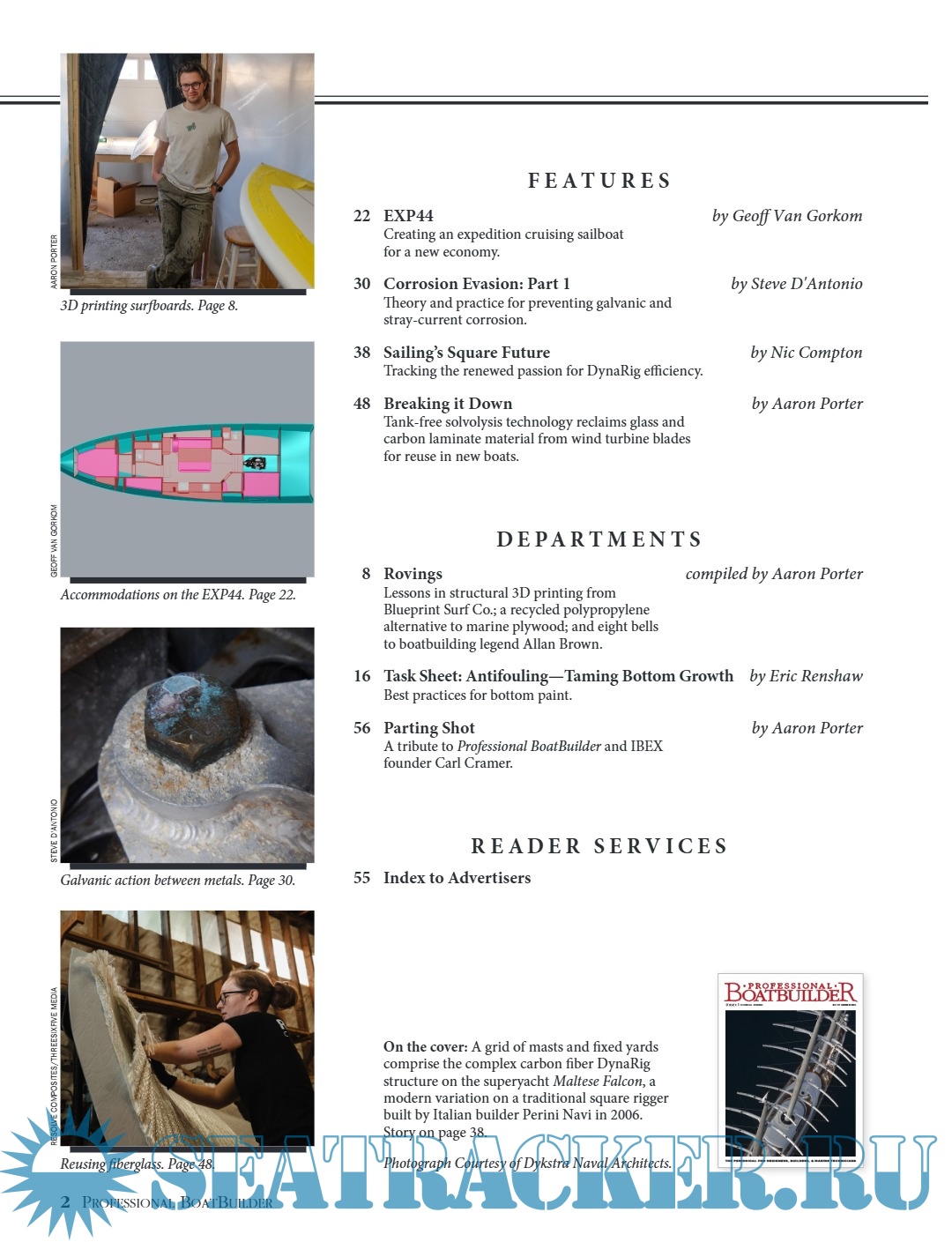 Description: It’s been a minute since we last spoke—half a year in fact—and a lot has happened: The magazine was shuttered in the fall; IBEX bought what assets remained and hired me to help take stock and plan the future; and I worked with IBEX staff to restructure and reanimate Professional BoatBuilder and proboat.com over the winter. Now we’re back with this first issue produced under new ownership. Thank you to so many subscribers and advertisers for your kind notes of inquiry and encouragement during our hiatus from publishing, and thanks to all readers, writers, and supporters for your patience and faith that we would revive ProBoat to serve our beloved industry again.