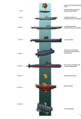 Mais l’histoire des sous-marins n’est pas seulement militaire, elle est aussi scientifique avec l’exploration des fonds sous-marins. Si les terres émergées ne réservent plus beaucoup de surprises, les profondeurs sous-marines restent pour partie Terra incognita ou plutôt Mare incognita. À bord de son bathyscaphe Le Trieste, Auguste Piccard réussit à descendre en 1960 dans la fosse des Mariannes, la plus profonde au monde (plus de 10 900 m).