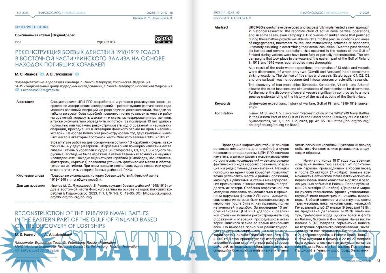 Описание: Научный журнал «Гидрокосмос» — первое в России междисциплинарное издание о подводных исследованиях. Он задуман как площадка для обсуждения научных проблем изучения свидетельств взаимодействия людей с морями, озерами и реками, исследованиям смежных занятий и ремесел, а также ныне затопленных участков суши. В повестку издания входят теоретические и методологические вопросы подводных исследований; проблемы морской археологии, связанные с консервацией и реставрацией предметов, обнаруженных в воде; вопросы сохранности объектов культурного наследия; вопросы технического, медицинского, организационного и юридического обеспечения подводных археологических работ. Журнал «Гидрокосмос» создан как инструмент для укрепления сообщества теоретиков и практиков подводных исследований, для обеспечения синергии в дальнейшем развитии отрасли в России.