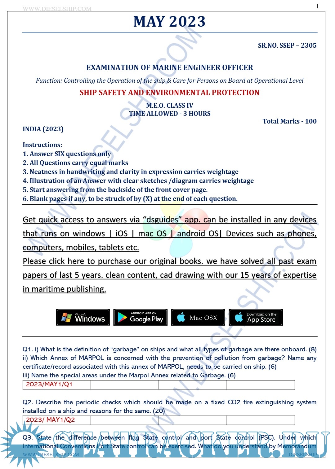 Question Paper Set for Marine Engineering Officer (M.E.O.) Class IV (May 2023) Examinations, India…