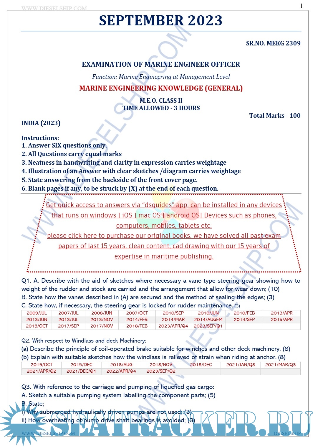 Question Paper Set for Marine Engineering Officer (M.E.O.) Class II (November 2023) MMD…