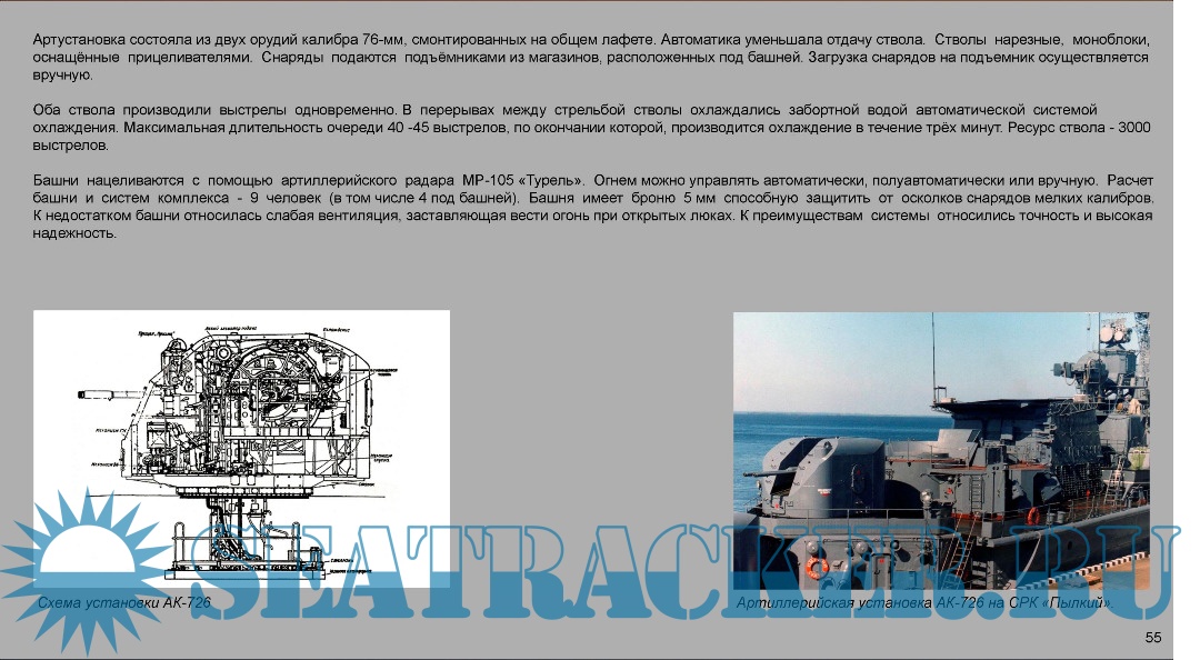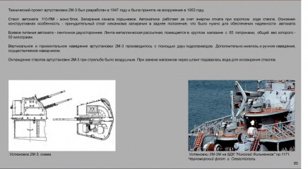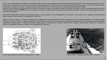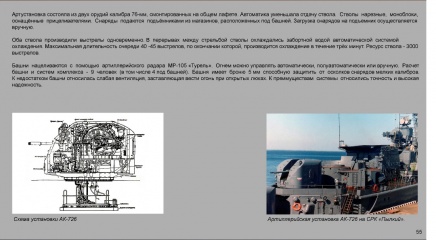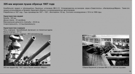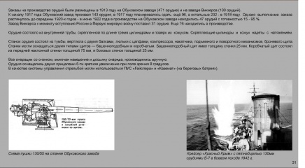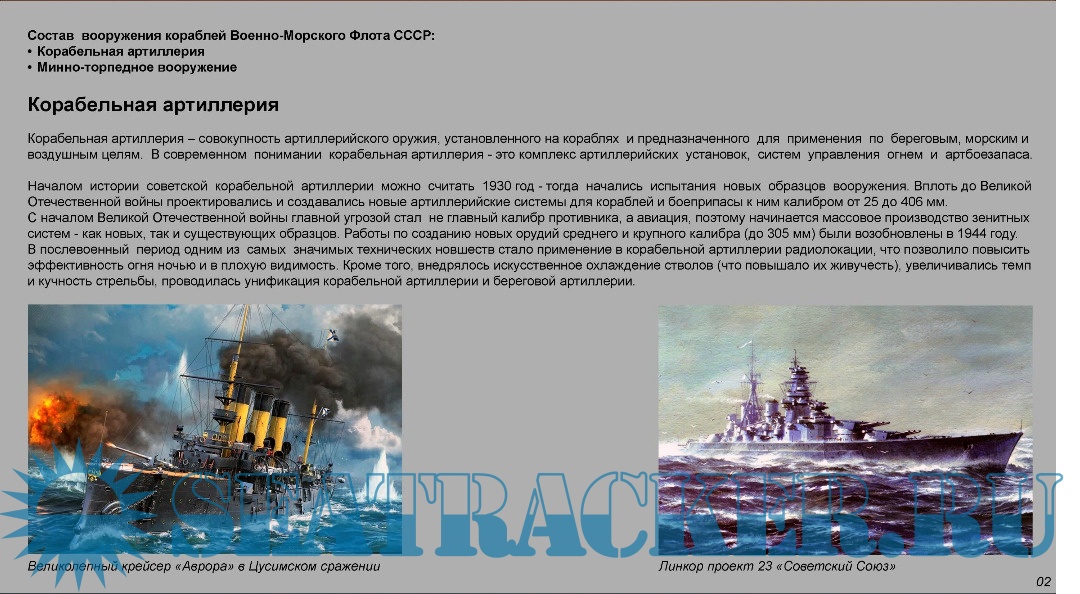 Описание: Сотрудником филиала Центрального военно-морского музея на крейсере "Аврора" К. Г. Мюллером к 75-летию Победы в Великой Отечественной войне подготовлена электронная выставка "Вооружение Военно-Морского Флота СССР. 1930-1960". Она представляет собой информационные слайды, повествующие о становлении советской корабельной артиллерии и минно-торпедного вооружения.