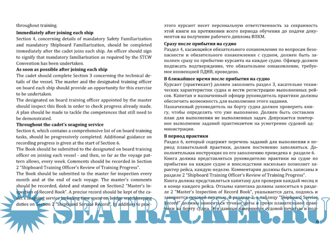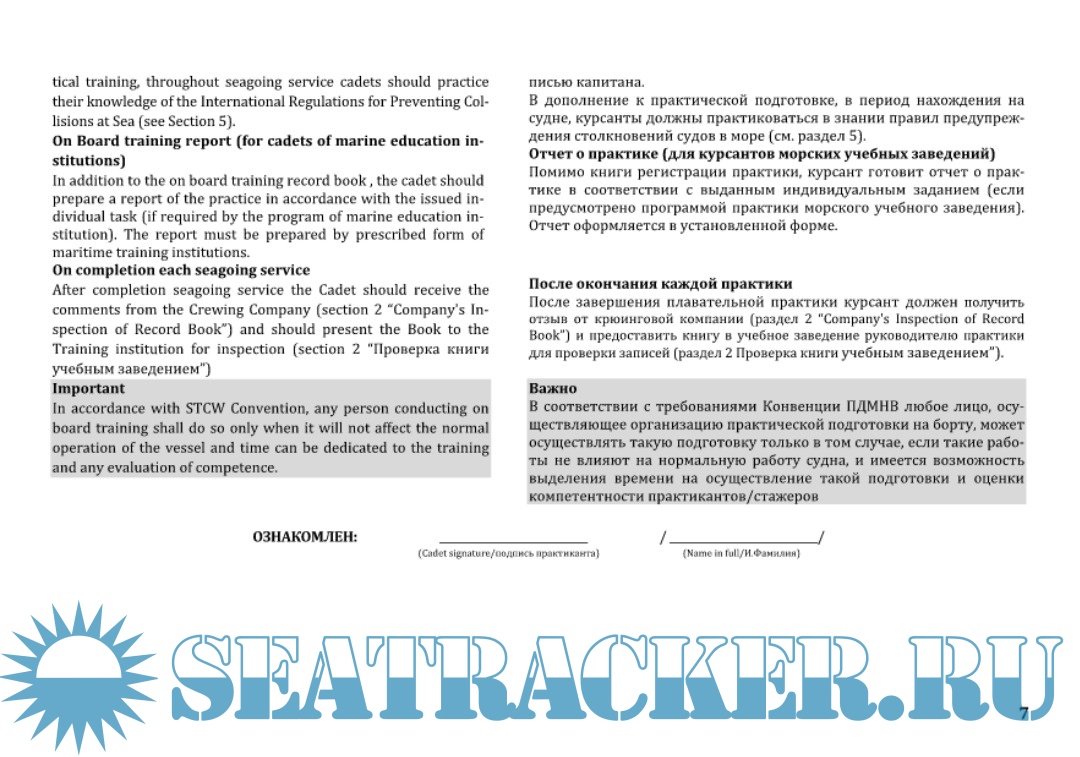Описание: Книга регистрации практической подготовки предназначена для документирования судовой практики вахтенного помощника капитана (практиканта-судоводителя) в соответствии с требованиями Конвенции ПДНВ-78 с поправками. В ней фиксируются все учебные мероприятия, навыки, оценки и подтверждения со стороны квалифицированных офицеров и капитана судна. Книга обеспечивает подготовку к сертификации на должность офицера, ответственного за навигационную вахту на судах валовой вместимостью 500 рег. тонн и более, поддерживает высокий уровень профессиональных компетенций и соблюдение международных стандартов безопасности на море.-The onboard training record book is designed to document the practical training of deck cadets in compliance with the STCW Convention 1978, as amended. It records all training activities, skills, assessments, and endorsements by qualified officers and the ship’s master. The book supports preparation for certification as an Officer in Charge of a Navigational Watch on ships of 500 gross tonnage or more, ensuring professional competence and adherence to international maritime safety standards.