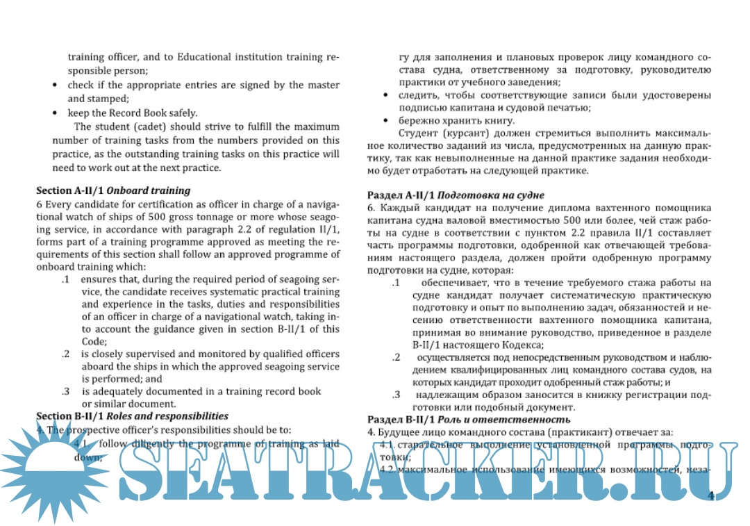 Год выпуска: 2014 Язык: Русский, Английский Автор: А. Л. Боран-Кешишьян Жанр: Documentation Издательство: НГМА Формат: PDF Качество: Отсканированные страницы Количество страниц: 137 Описание: Книга регистрации практической подготовки предназначена для документирования судовой практики вахтенного помощника капитана (практиканта-судоводителя) в соответствии с требованиями Конвенции ПДНВ-78 с поправками. В ней фиксируются все учебные мероприятия, навыки, оценки и подтверждения со стороны квалифицированных офицеров и капитана судна. Книга обеспечивает подготовку к сертификации на должность офицера, ответственного за навигационную вахту на судах валовой вместимостью 500 рег. тонн и более, поддерживает высокий уровень профессиональных компетенций и соблюдение международных стандартов безопасности на море.-The onboard training record book is designed to document the practical training of deck cadets in compliance with the STCW Convention 1978, as amended. It records all training activities, skills, assessments, and endorsements by qualified officers and the ship’s master. The book supports preparation for certification as an Officer in Charge of a Navigational Watch on ships of 500 gross tonnage or more, ensuring professional competence and adherence to international maritime safety standards.
