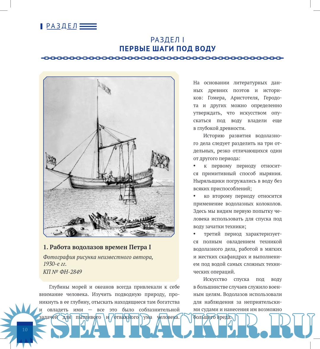 В данной работе систематизирована и представлена богатейшая коллекция водолазного снаряжения, инструментов для подводных работ, осветительных приборов, помп, средств связи и других атрибутов подводных работ (спасательных, поисковых технических, диверсионных и научноисследовательских) за всю историю музея с 1709 года по настоящее время.