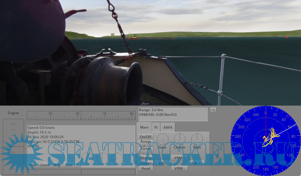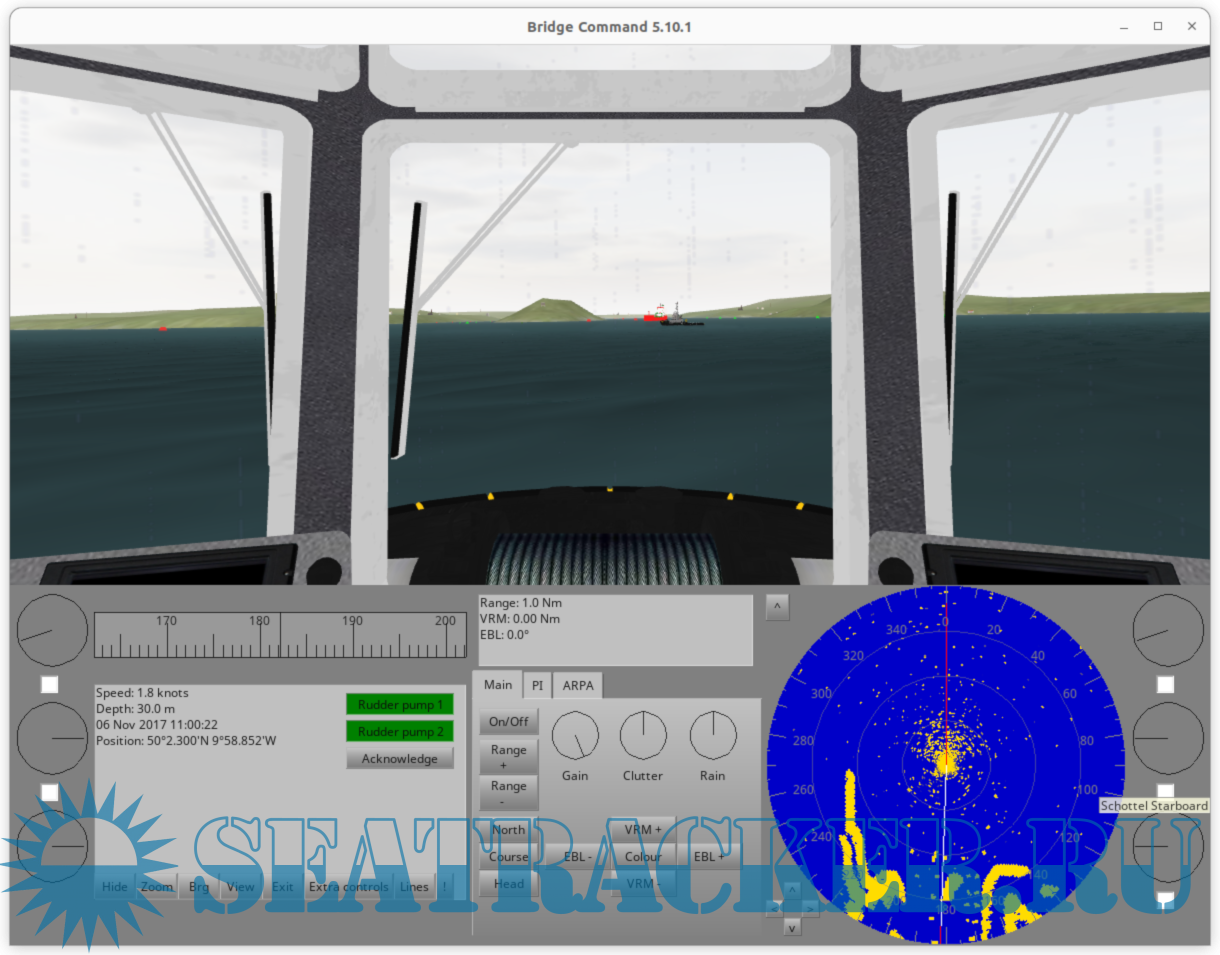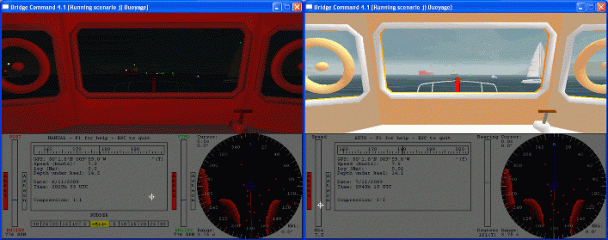 Bridge Command is very highly flexible, with the environmental model, ships, buoys, individual scenarios and almost all aspects of the simulation being configurable to your own needs. Bridge Command can be run on a single computer, with no additional devices needed. It can also be run with physical controls, and has an interface where a trainer can control scenarios in order to carry out training exercises, from a second computer. It can display on a single screen, or can display a full panoramic view across multiple screens using multiple computers. The radar picture is simulated in real-time, and includes standard marine radar controls such as gain and clutter, as well as features such as parallel indexes and ARPA contact tracking.