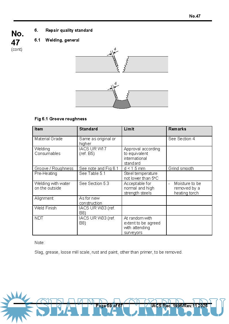 PART A Shipbuilding and Remedial Quality Standards for New Construction References Standards 1. Scope 2. General requirements for new construction 3. Qualification of personnel and procedures 4. Materials 5. Gas Cutting 6. Fabrication and fairness 7. Alignment 8. Welding Joint Details 9. Remedial PART B Shipbuilding and Repair Quality Standard for Existing Ships References Standards 1. Scope 2. General requirements for repairs and repairers 3. Qualification of personnel 4. Materials 5. General requirements to welding 6. Repair quality standard