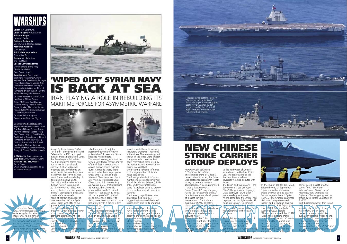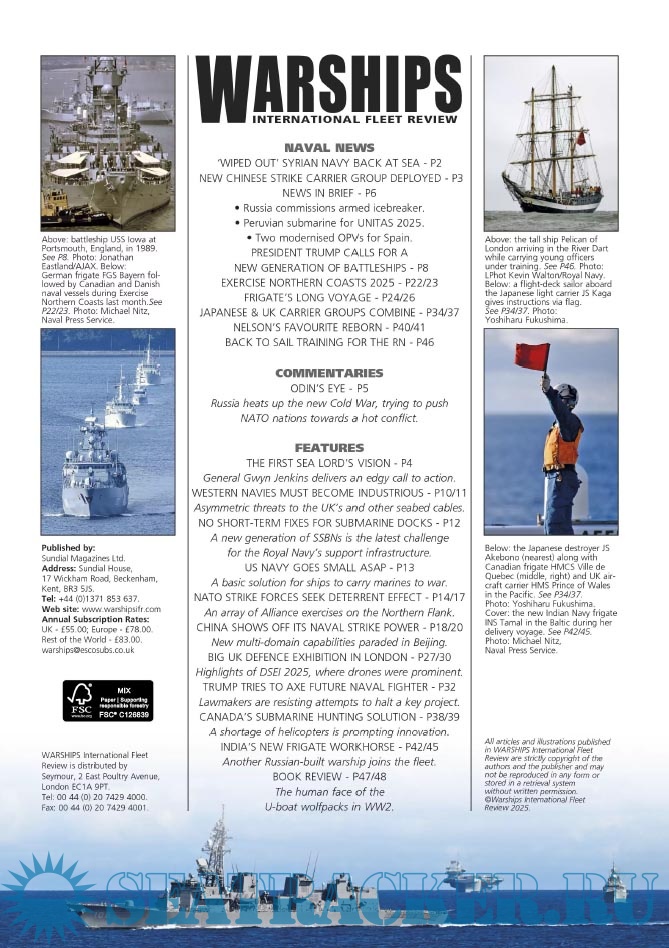 Description: Warships IFR puts the spotlight on the latest developments in the world’s navies. It covers current defence issues and has comments by leading analysts. The magazine regularly includes features on the Royal Navy and the US Navy in addition to incorporating news and features on all other navies across the globe. Warships IFR frequently carries in-depth articles on naval heritage.WARSHIPS International Fleet Review is published 12 times a year by Tandy Media Ltd who also publish Shipping Today & Yesterday (which provides news and features from the world of merchant shipping).