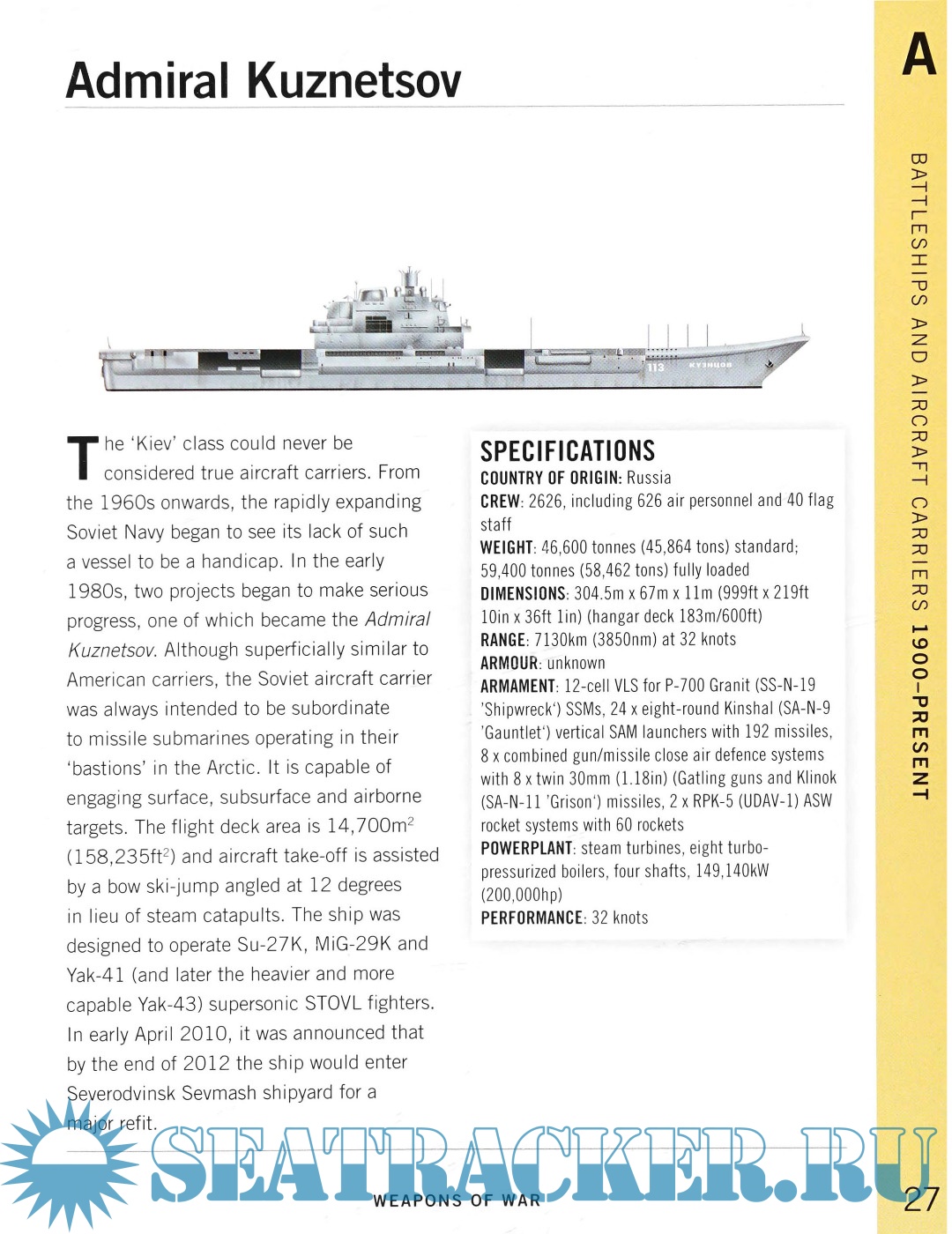 Each entry includes a specifications table with essential information such as armament, weight, speed, and range
