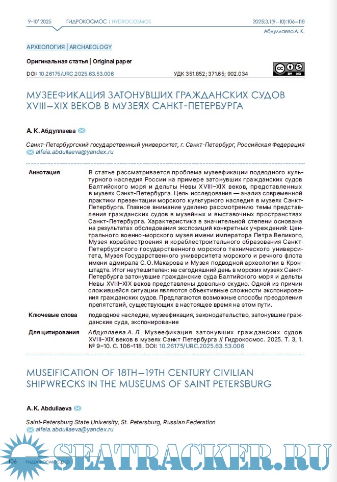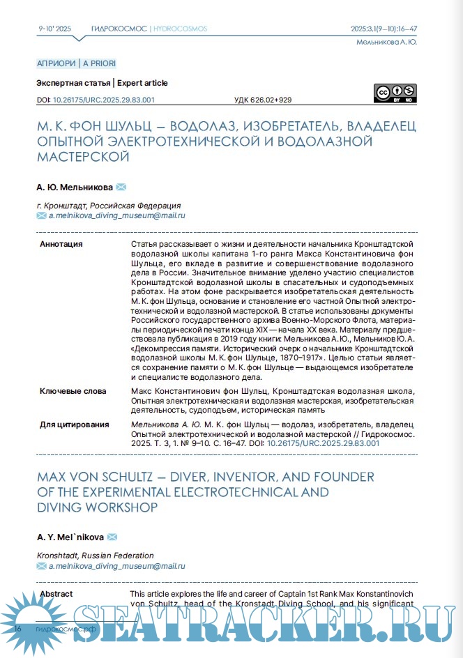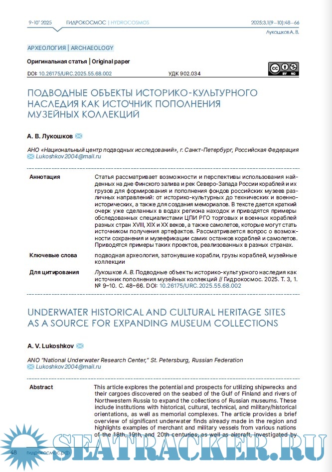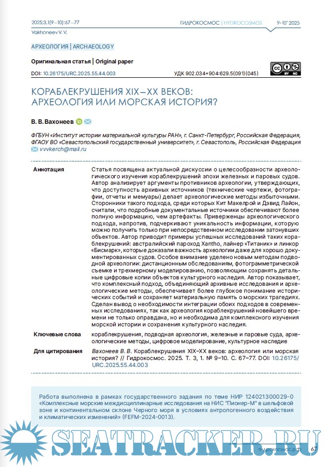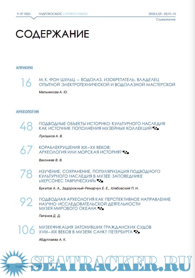 Описание: Научный журнал «Гидрокосмос» — первое в России междисциплинарное издание о подводных исследованиях. Он задуман как площадка для обсуждения научных проблем изучения свидетельств взаимодействия людей с морями, озерами и реками, исследованиям смежных занятий и ремесел, а также ныне затопленных участков суши. В повестку издания входят теоретические и методологические вопросы подводных исследований; проблемы морской археологии, связанные с консервацией и реставрацией предметов, обнаруженных в воде; вопросы сохранности объектов культурного наследия; вопросы технического, медицинского, организационного и юридического обеспечения подводных археологических работ. Журнал «Гидрокосмос» создан как инструмент для укрепления сообщества теоретиков и практиков подводных исследований, для обеспечения синергии в дальнейшем развитии отрасли в России.