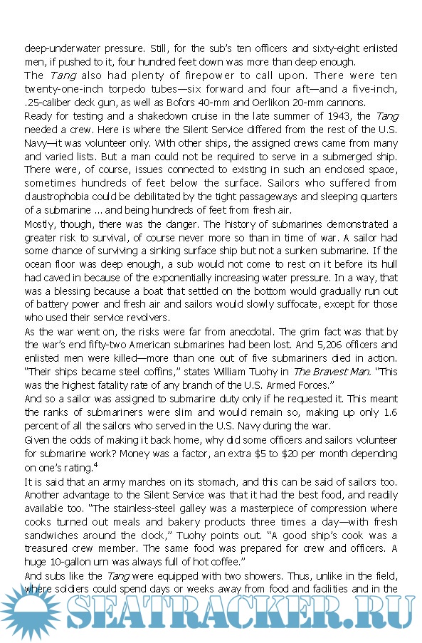 The Tang achieved its greatest success on October 24, 1944, when it took on an entire Japanese convoy and destroyed it. But its 24th and last torpedo boomeranged, returning to strike the Tang. Mortally wounded, the boat sunk, coming to rest on the bottom, 180 feet down. After hours of struggle, nine of the 87 crewmen, including O’Kane, made it to the surface.