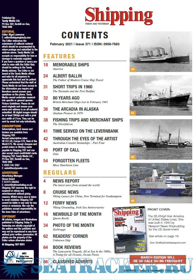 Year: 2021 Language: English Author: Shipping Today and Yesterday Edition: 2021-02 Format: PDF Quality: eBook Pages count: 68 Description: Shipping T&Y is a monthly magazine for the shipping enthusiast offering up-to-date information,topical and in-depth historical articles alongside images, many of which are exclusive to the magazine.