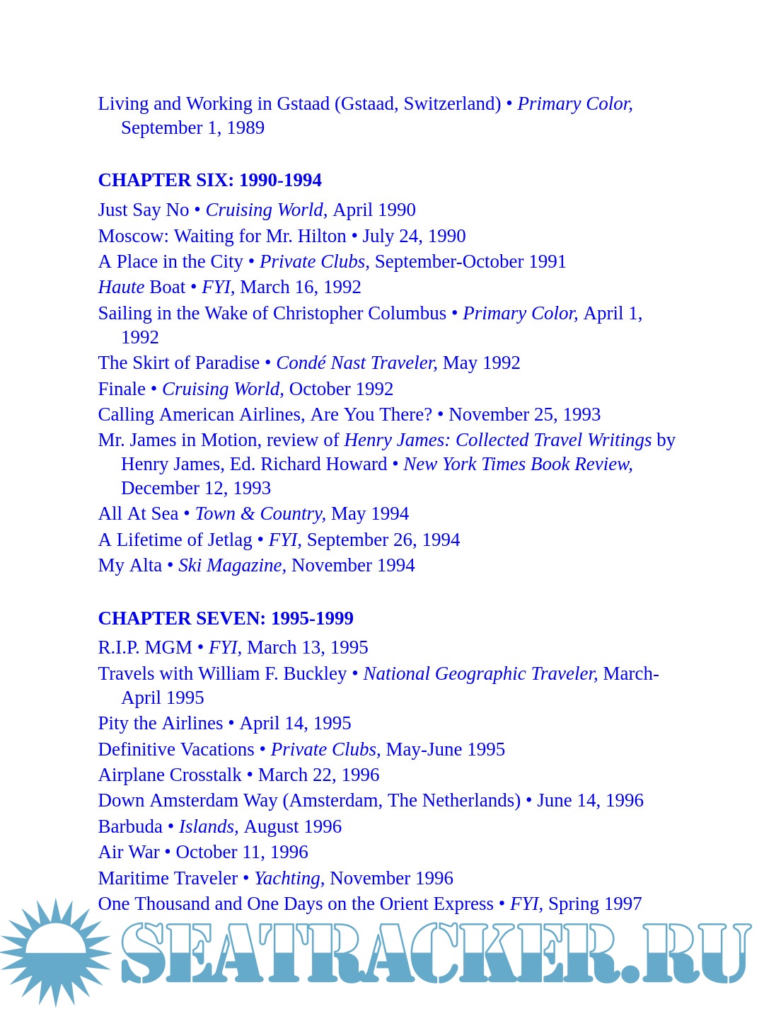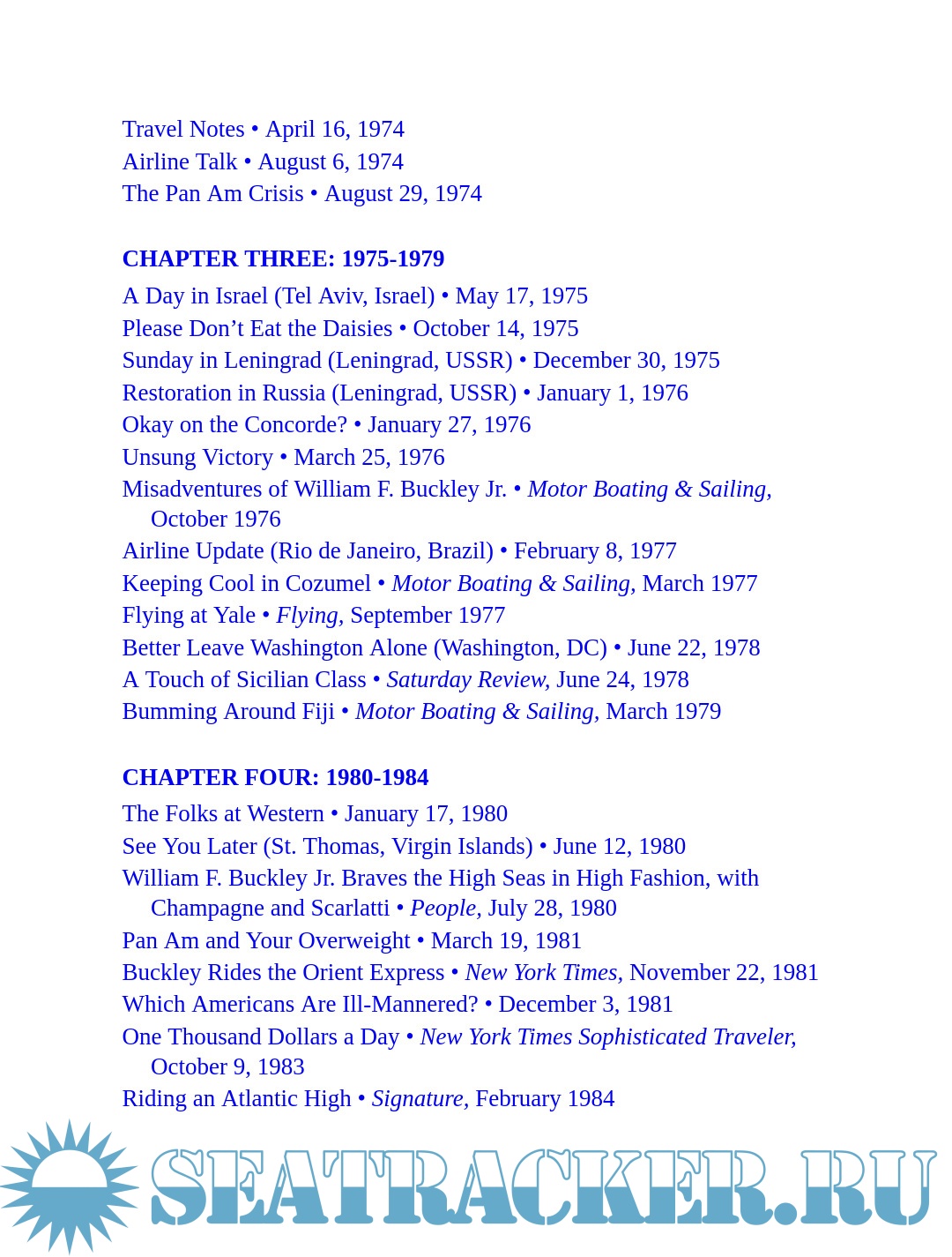 Description: An elegant jet-setter with a flair for literary journalism, Buckley had few rivals in the art of travel writing. He took first place in the Magazine Article on Foreign Travel category in the Lowell Thomas Travel Journalism Competition for eight pieces written while “Concording around the world” in 1989. A master storyteller, he adeptly wove devices of fiction together with reportage to craft entertaining pieces full of exuberance and authority. Being a Bach afficionado, he composed his sentences for a well-tuned ear.