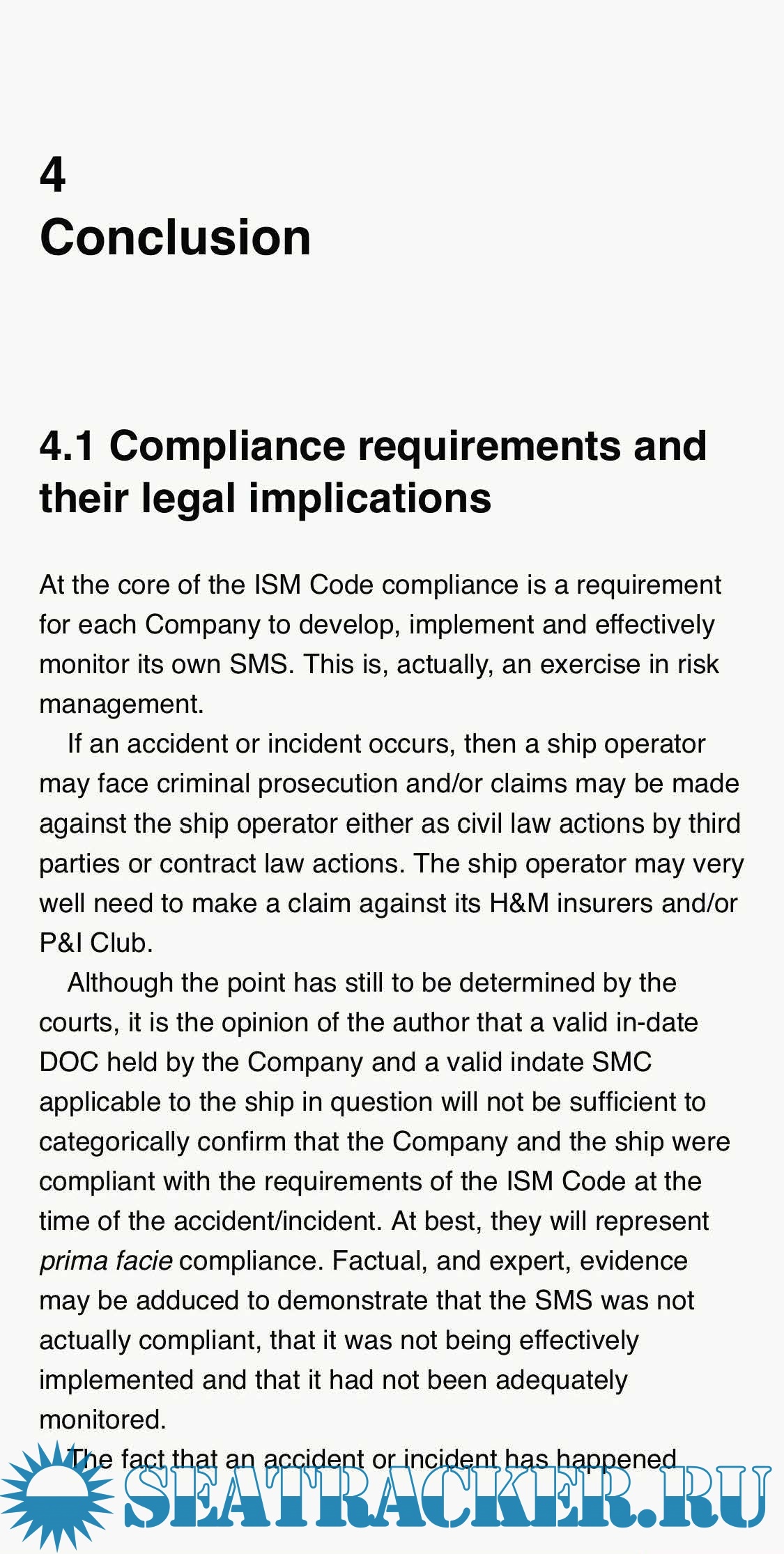 The ISM Code has been mandatory for almost every commercial vessel in the world for more than a decade and nearly two decades for high risk vessels, yet there is very little case law in this area. Consequently, there remains a great deal of confusion about the potential legal and insurance implications of the Code.