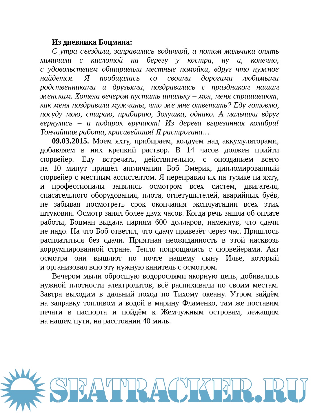 Описание: Книга описывает повседневную жизнь, полную риска, и захватывающие приключения в кругосветном плавании, совершённом авторами на парусной яхте в период с 2014 по 2017 годы. В ней вы прочтёте о далёких странах, моряцких буднях, охоте, рыбалке и якорных стоянках на экзотических островах. Путешествие не было увеселительным круизом. Иногда требовалось собрать все силы и мужество, чтобы не отчаяться, оказавшись выброшенными вместе с яхтой на необитаемый коралловый риф в тысячах миль от цивилизации.