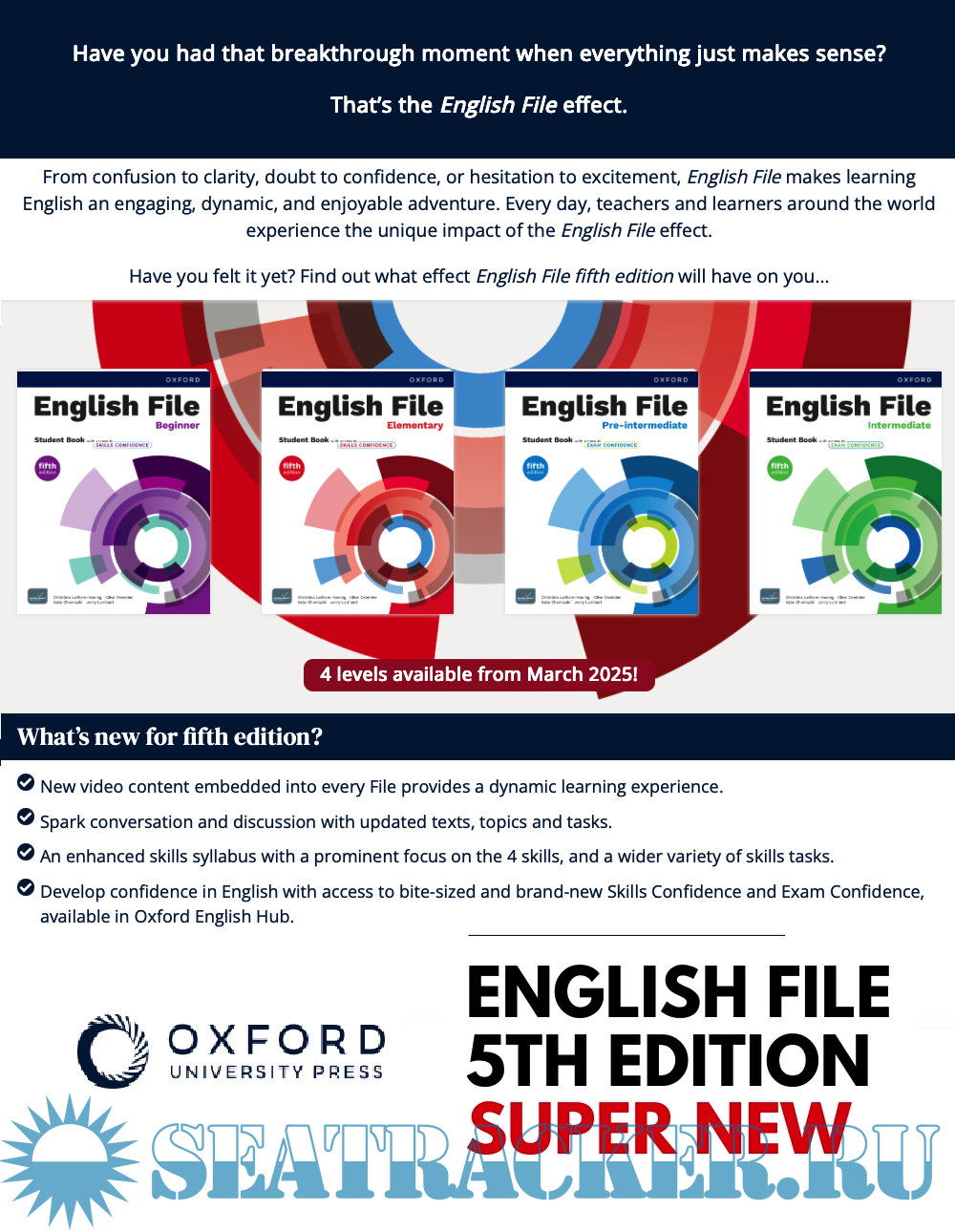 Year: 2025 Language: English Author: Christina Latham-Koenig Genre: Educational courses Publisher: Oxford University Press Edition: Fifth Edition ISBN: 9780194148993 and Ohers Format: PDF, MP3, MP4 Quality: eBook Pages count: Multiple Video quality: HD Video codec: MPEG-4 AAC, H.264 Video: 1280 x 720 25 fps Audio codec: AAC Audio: 48.0 kHz x 320 kbs Description: Engage with authentic and motivating texts, topics, and tasks that will keep you talking. Video enhanced lessons throughout every File helps students learn and practice Grammar, Vocabulary, and Pronunciation, and develops their listening and viewing skills. Video types used throughout the course include documentaries, drama, interviews, animation, vox pops and teacher generated video. Make progress with English File’s proven methodology and balance of language and skills, which builds your confidence to communicate. Key Future: • New video content embedded into every File provides a dynamic learning experience. • New drama video story that runs across Elementary, Pre-Intermediate, and Intermediate provides a drama with twists, turns and cliffhanging endings whilst introducing high frequency functional English and social English phrases. • Enhanced skills syllabus with a prominent focus on the 4 skills, and a wider variety of skills tasks. • The print Student Book comes with access to Skills Confidence (Beginner, Elementary) and Exam Confidence (Pre-Intermediate, Intermediate, Intermediate Plus, Upper Intermediate, Advanced, Advanced Plus). Develop your confidence in English with access to bite-size Reading, Listening, Speaking, and Writing practice that complements the course, available in Oxford English Hub. • In the higher levels, Colloquial English provides new interviews, exclusive to English File, with well-known personalities and experts in their field. • British English course | Language Level: A1 - C2. :
