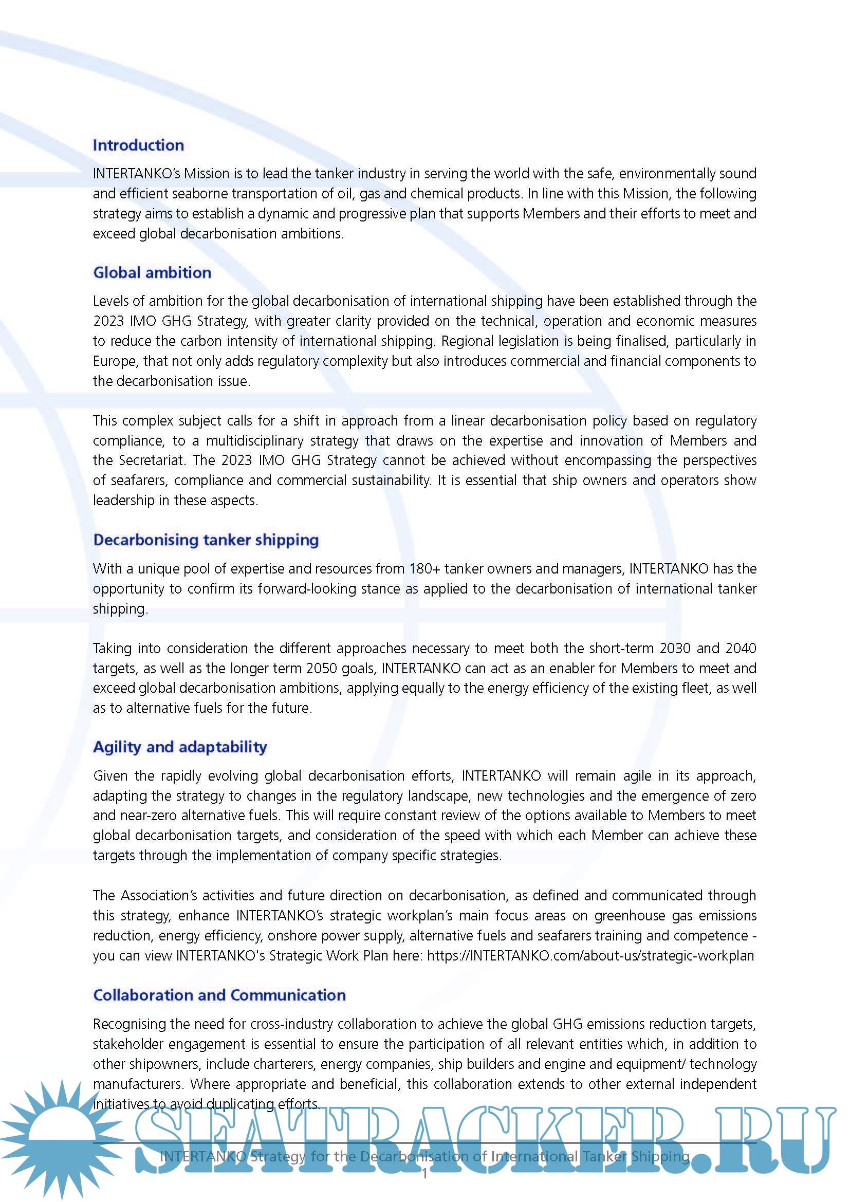 Description: INTERTANKO’s Mission is to lead the tanker industry in serving the world with the safe, environmentally sound and efficient seaborne transportation of oil, gas and chemical products. In line with this Mission, the following strategy aims to establish a dynamic and progressive plan that supports Members and their efforts to meet and exceed global decarbonization ambitions.