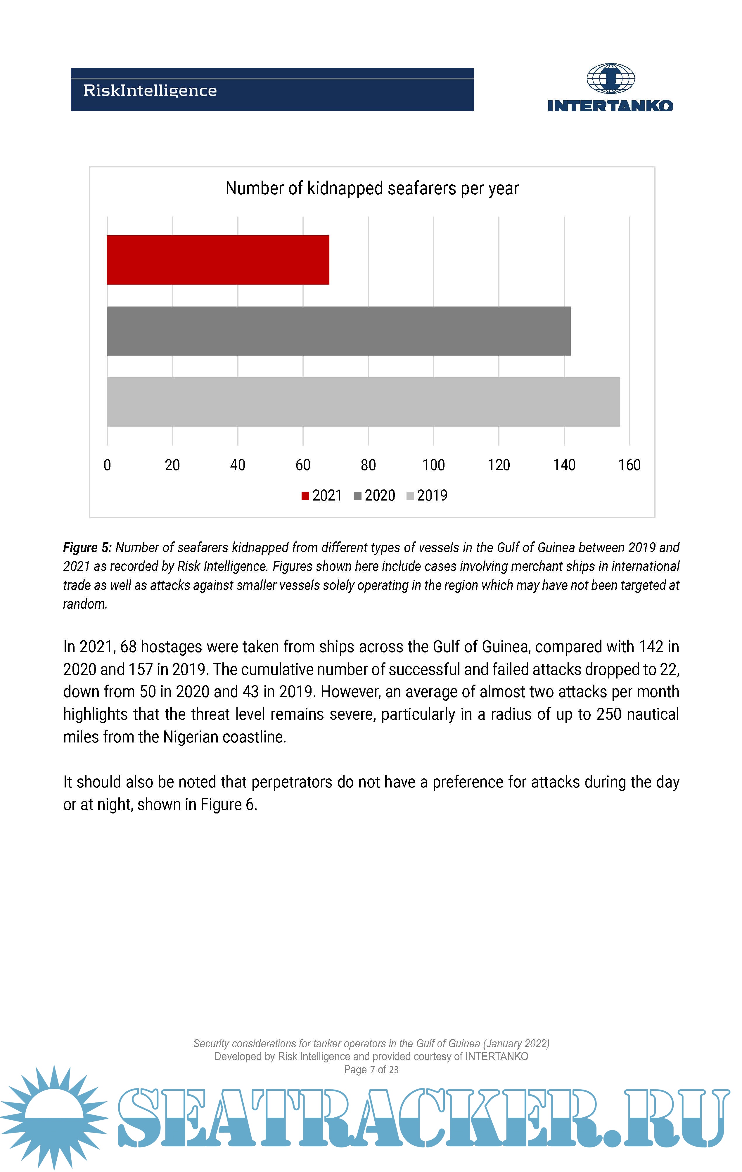 Description: Frequent attacks against merchant ships in the Gulf of Guinea, often involving tankers, continue to be a problem for tanker operators. Despite a drop in the number of attacks in 2021 compared with the previous year, the threat level for tanker vessels of all types remains significant. Several successful and attempted kidnap-for-ransom attacks between October and December, including attacks at significant distances from the coastline, have underlined the issue. Overall, the maritime security situation in the Gulf of Guinea remains fragile.