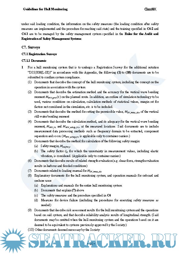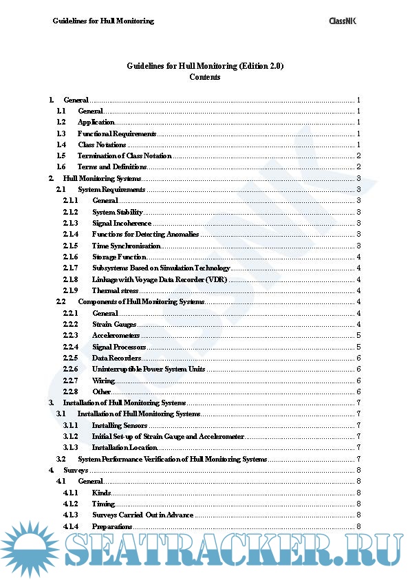 Year: 2025 Language: English Author: ClassNK Genre: Guide Publisher: ClassNK Edition: 2.0 (November 2025) Format: PDF Quality: eBook Pages count: 34 Description: In recent years, efforts to utilise hull monitoring as means for enhancing ship safety have become more widespread due to improvements in sensing and simulation technologies as well as developments in ship-to-shore communication and big data analysis technology. This “Guidelines for Hull Monitoring” specifies the requirements that the hull monitoring system is to satisfy to achieve its intended purpose. The objectives of the hull monitoring system envisioned by the Guidelines include supporting the maintenance and management of the hull structure, assisting in navigation and cargo loading decisions, and contributing to the enhancement of ship safety and operational efficiency. The users of the hull monitoring system are assumed to vary depending on its purpose. In addition to onboard users such as ship personnel, land-based users responsible for operating the system are also considered. The information provided by the hull monitoring system is not to be a substitute for the judgment and the responsibility of ship personnel. In this revision, technical requirements have been specified for systems that support decision making related to loading with improved loading efficiency and operations based on specific loading conditions as a further application of monitoring and digital technologies.