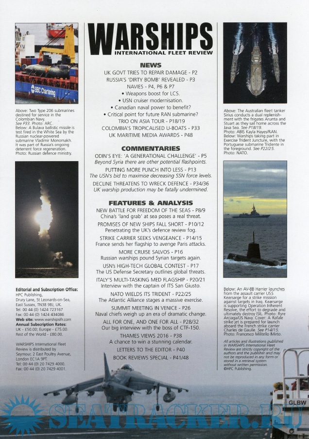 Description: Warships IFR puts the spotlight on the latest developments in the world’s navies. It covers current defence issues and has comments by leading analysts. The magazine regularly includes features on the Royal Navy and the US Navy in addition to incorporating news and features on all other navies across the globe. Warships IFR frequently carries in-depth articles on naval heritage.WARSHIPS International Fleet Review is published 12 times a year by Tandy Media Ltd who also publish Shipping Today & Yesterday (which provides news and features from the world of merchant shipping).