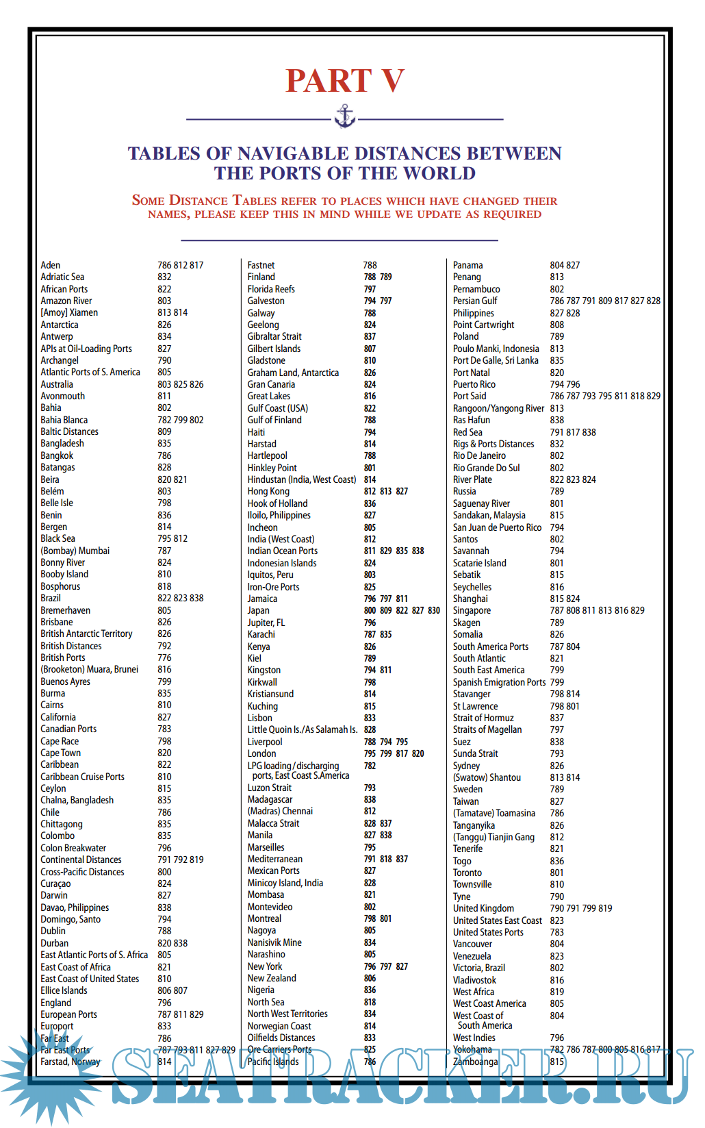 - V Navigable Distance Tables giving a world-wide coverage of total distances from the principal ports of Britain, U.S.A. and Canada, to all important ports of the world.