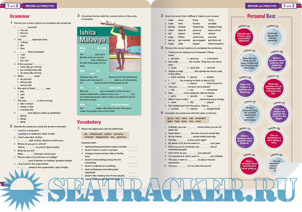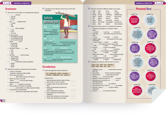 The Personal Best * Student’s Book is divided into separate language and skills lessons so that students can focus on the new grammar and lexis, without having to struggle through long reading or listening texts. Each level has a comprehensive skills syllabus, with a particular emphasis on speaking and writing. Clear Builder and Skills boxes allow students to see exactly which skills are being focused on and the extended practice section at the back of the book offers further practice on grammar, vocabulary and communication. * The Workbook provides a page of practice for each Student’s Book lesson and an additional Review and Practice spread to review the content from the entire unit. * The Teacher’s Resource Book provides extensive photocopiable materials and unit tests. The photocopiable activities can be used as a change of focus or used to review at a later stage. The unit tests help with recall and provide a sense of progress. There are photocopiable activities for grammar, vocabulary, and skills.
