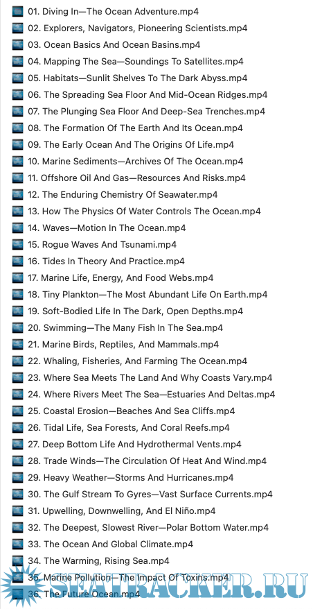 01. Diving In—The Ocean Adventure.mp4 02. Explorers, Navigators, Pioneering Scientists.mp4 03. Ocean Basics And Ocean Basins.mp4 04. Mapping The Sea—Soundings To Satellites.mp4 05. Habitats—Sunlit Shelves To The Dark Abyss.mp4 06. The Spreading Sea Floor And Mid-Ocean Ridges.mp4 07. The Plunging Sea Floor And Deep-Sea Trenches.mp4 08. The Formation Of The Earth And Its Ocean.mp4 09. The Early Ocean And The Origins Of Life.mp4 10. Marine Sediments—Archives Of The Ocean.mp4 11. Offshore Oil And Gas—Resources And Risks.mp4 12. The Enduring Chemistry Of Seawater.mp4 13. How The Physics Of Water Controls The Ocean.mp4 14. Waves—Motion In The Ocean.mp4 15. Rogue Waves And Tsunami.mp4 16. Tides In Theory And Practice.mp4 17. Marine Life, Energy, And Food Webs.mp4 18. Tiny Plankton—The Most Abundant Life On Earth.mp4 19. Soft-Bodied Life In The Dark, Open Depths.mp4 20. Swimming—The Many Fish In The Sea.mp4 21. Marine Birds, Reptiles, And Mammals.mp4 22. Whaling, Fisheries, And Farming The Ocean.mp4 23. Where Sea Meets The Land And Why Coasts Vary.mp4 24. Where Rivers Meet The Sea—Estuaries And Deltas.mp4 25. Coastal Erosion—Beaches And Sea Cliffs.mp4 26. Tidal Life, Sea Forests, And Coral Reefs.mp4 27. Deep Bottom Life And Hydrothermal Vents.mp4 28. Trade Winds—The Circulation Of Heat And Wind.mp4 29. Heavy Weather—Storms And Hurricanes.mp4 30. The Gulf Stream To Gyres—Vast Surface Currents.mp4 31. Upwelling, Downwelling, And El Niño.mp4 32. The Deepest, Slowest River—Polar Bottom Water.mp4 33. The Ocean And Global Climate.mp4 34. The Warming, Rising Sea.mp4 35. Marine Pollution—The Impact Of Toxins.mp4 36. The Future Ocean.mp4