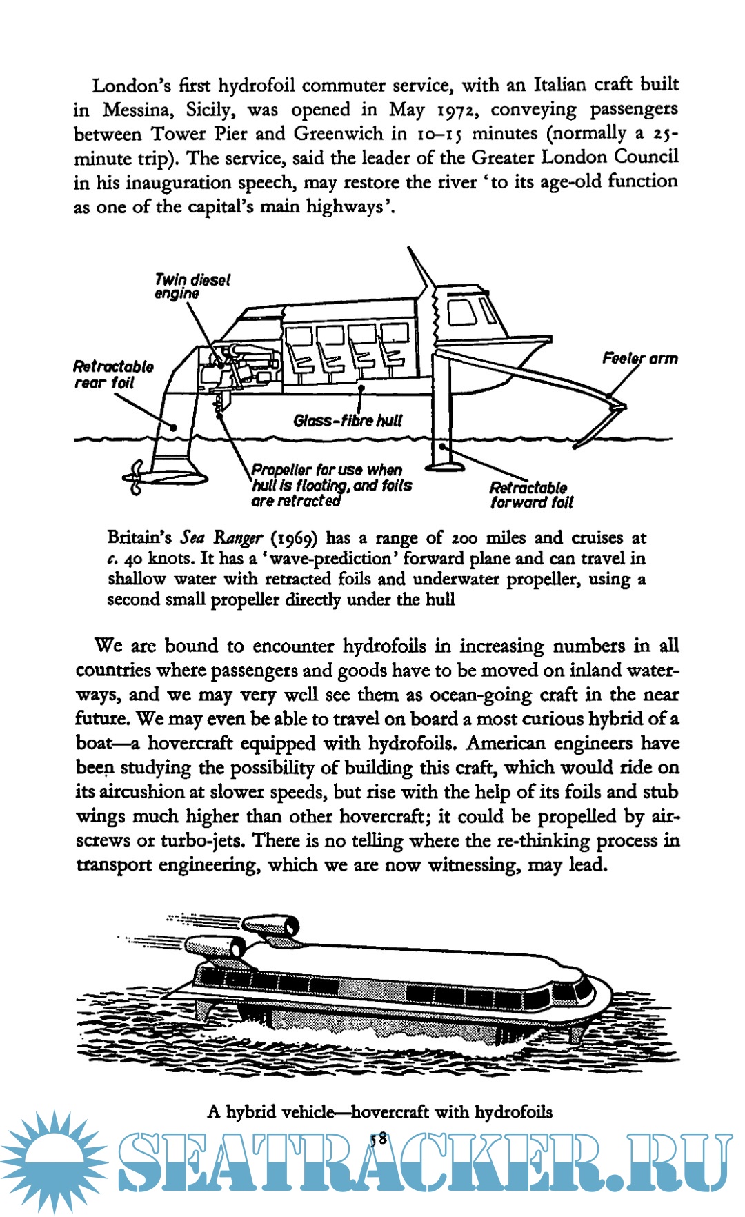 Description: Is it a ship or an aircraft? Strange new means of transport have sprung up in our time, but none stranger than hovercraft and hydrofoils. We are not even quite sure how to classify them-the air-cushion vehicle (as the hovercraft is called in technical language) flies above the water and the ground like a bird, but can't rise more than a few feet; the winged or legged boat-the hydrofoil-almost leaves the water, but cannot move without it. These surface-skimming craft (another technical term) have opened a new world of inventive imagination to our transport designers. We shall probably travel in air-cushion vehicles at high speed over land as we already do over the water; aero-trains, hovercars, giant ocean-going hydrofoil ships are in the offing, and air-cushion techniques have been ntroduced in medicine and industry. Oddly enough, even a combination of hovercraft and hydrofoil boat is being developed.